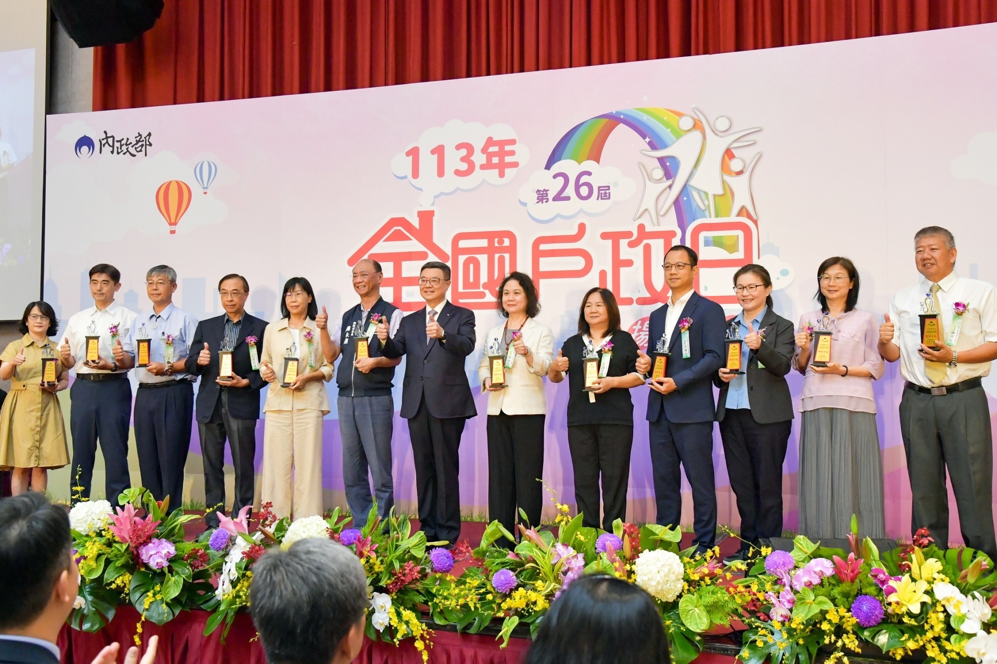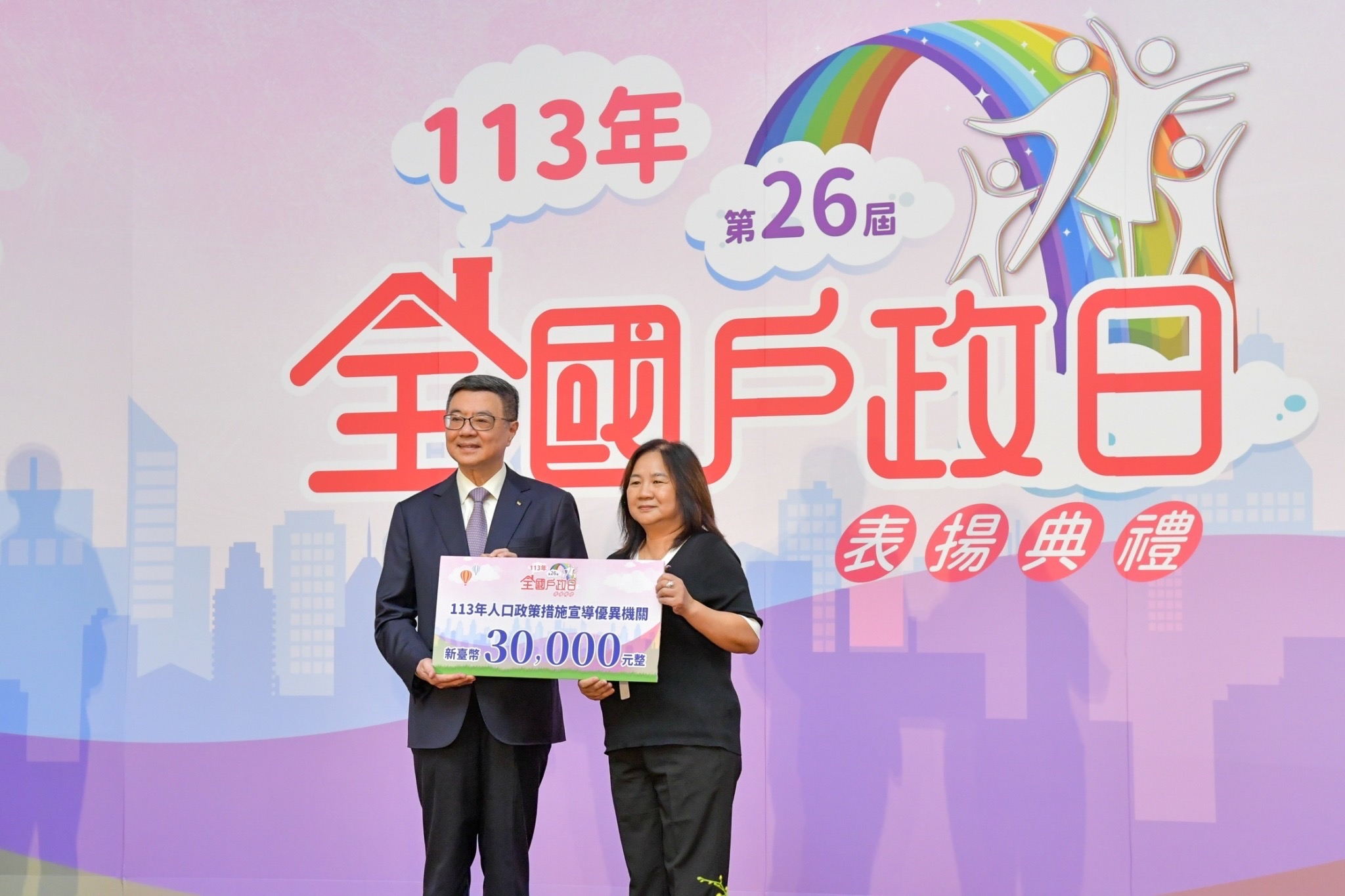 接續,卓院長逐一頒發「推行人口政策績效優良獎」,由臺北市政府、桃園市政府、屏東縣政府、基隆市政府、新北市政府、高雄市政府、彰化縣政府、南投縣政府、雲林縣政府、花蓮縣政府、澎湖縣政府及金門縣政府等12個機關獲獎,並分別與各受獎機關代表合影留念。院長並特別頒發3萬元獎勵金予臺北市政府、桃園市政府、屏東縣政府、基隆市政府等前4名機關,肯定其優異表現。最後,院長也與所有得獎者一同合影留念,現場互動熱絡。
