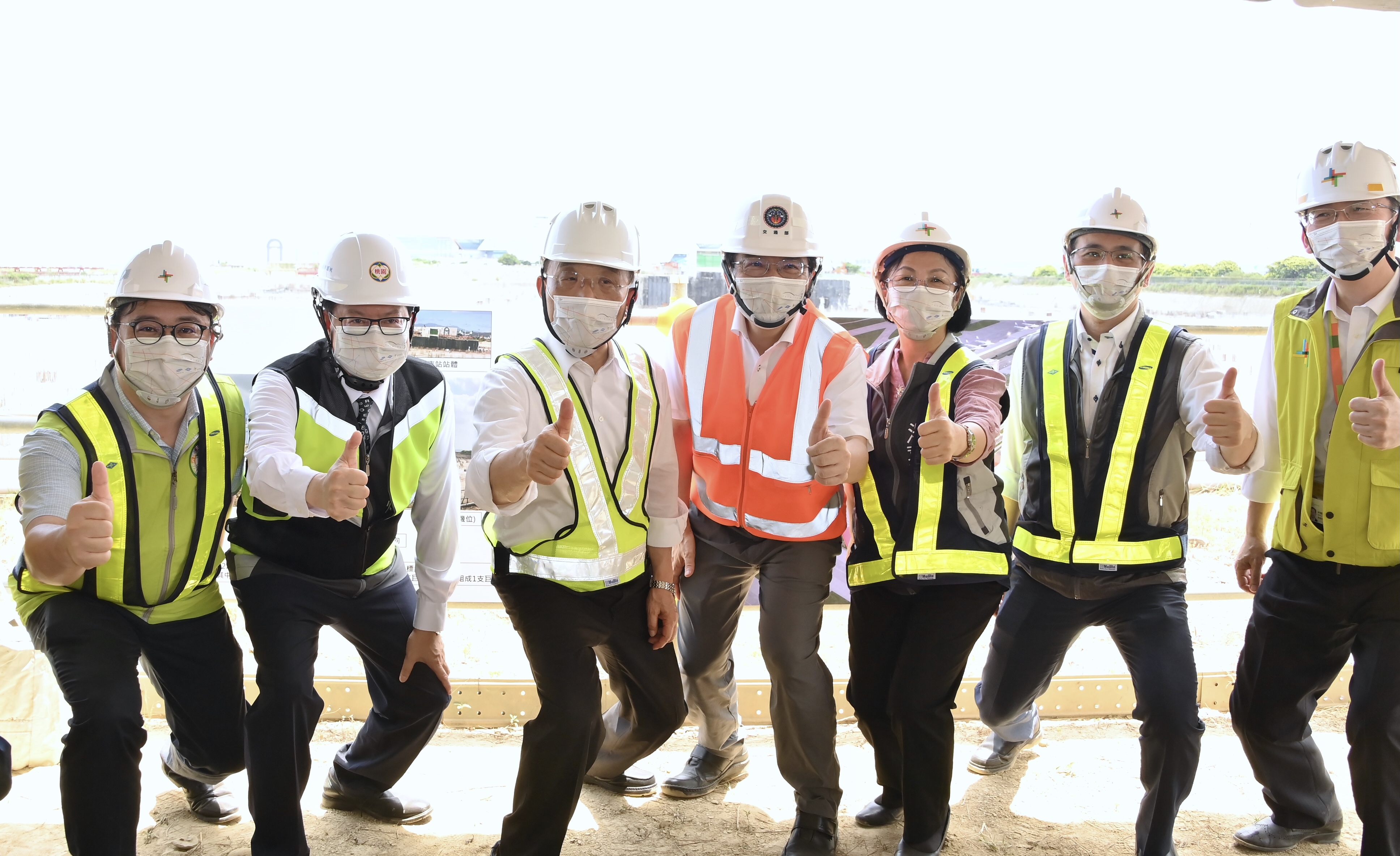 蘇院長今日現地視察,聽取桃園國際機場公司董事長林國顯說明現況及未來工程完工後建設對照,也與來賓及團隊共同豎起大拇指比讚合影留念。