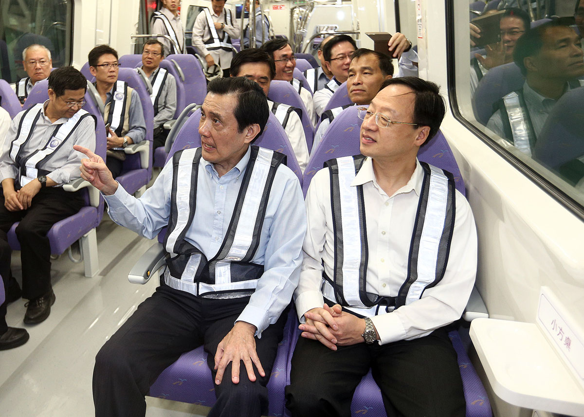 此行江院長陪同總統視察電聯車首度進入臺北車站,啟動最後階段的機電測試,隨後亦登上捷運電聯車實地體驗直達車廂內的舒適乘坐空間和內裝設計,並瞭解未來預辦登機的行李車廂運作情形。