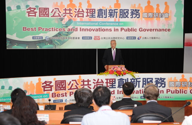 行政院長吳敦義今(25)日出席「各國公共治理創新服務」國際研討會時表示,公共治理是政府興衰成敗的關鍵,政府機關應發揮真誠、效率、同理心,提昇公共服務品質,感謝來自國內外各個不同領域的專家學者,共同交流成功的公共治理案例,並鼓勵此次國內得獎或入圍機關繼續精進展望未來。