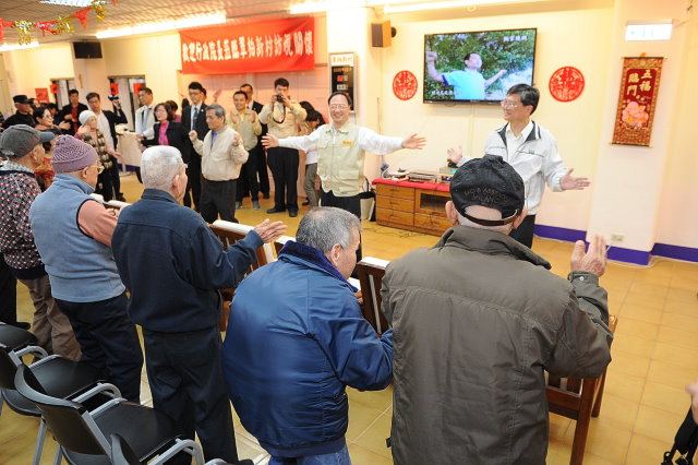 江院長除了致贈加菜金及賀歲福袋之外,也和長輩一起做五行健康操,另並實地訪視長輩宿舍,與長者閒話家常,場面溫馨。