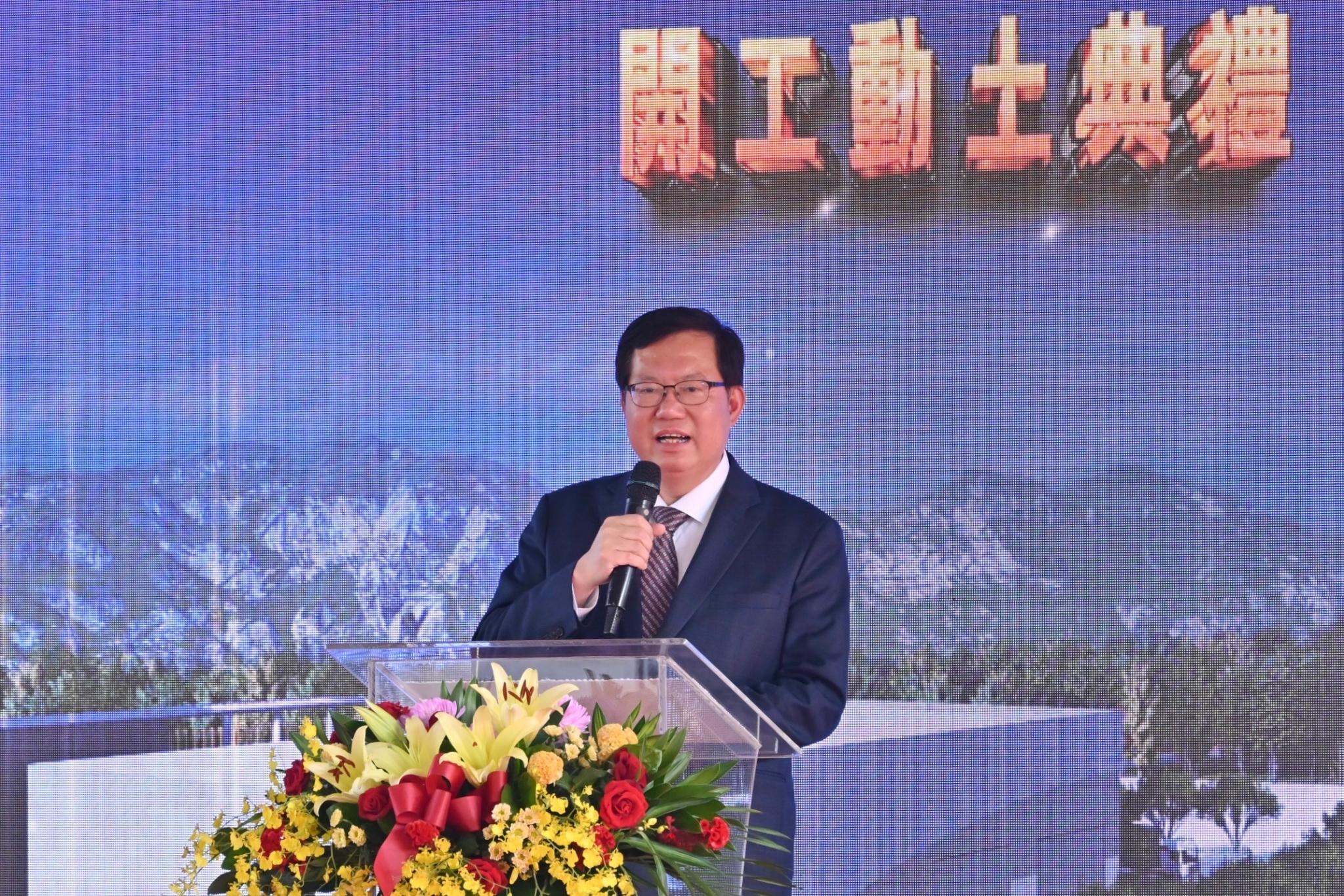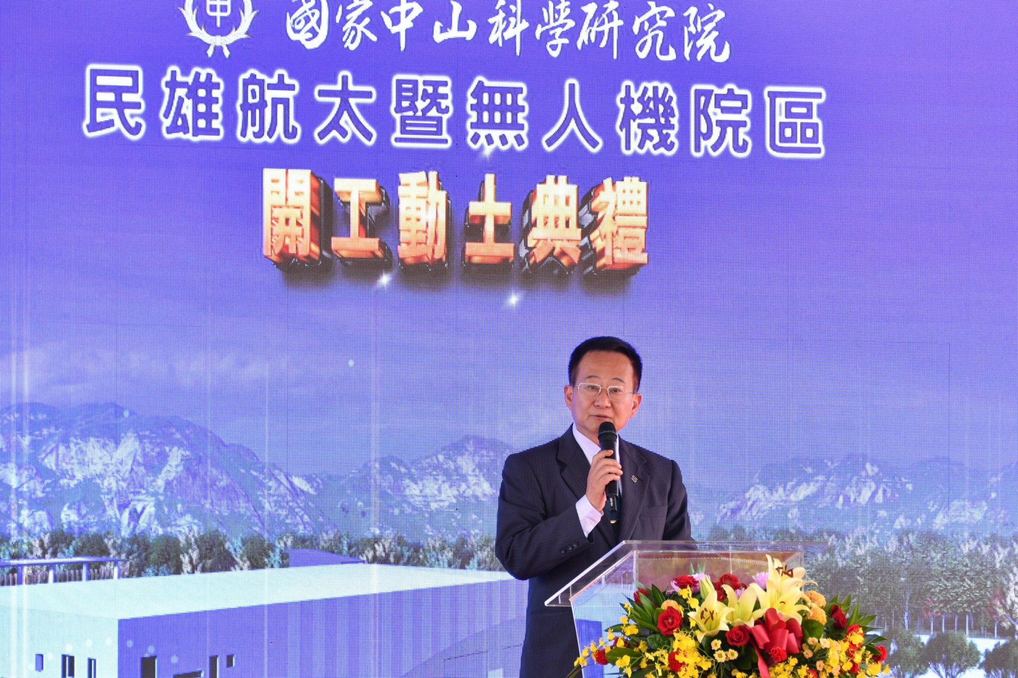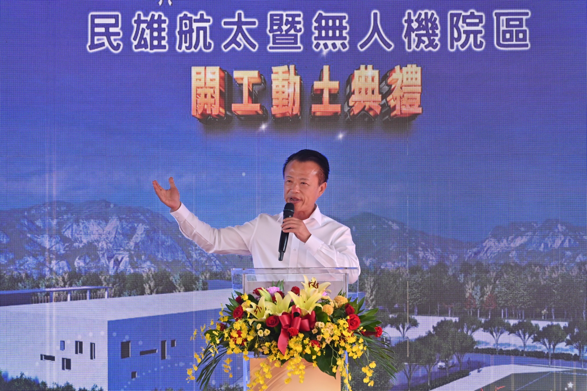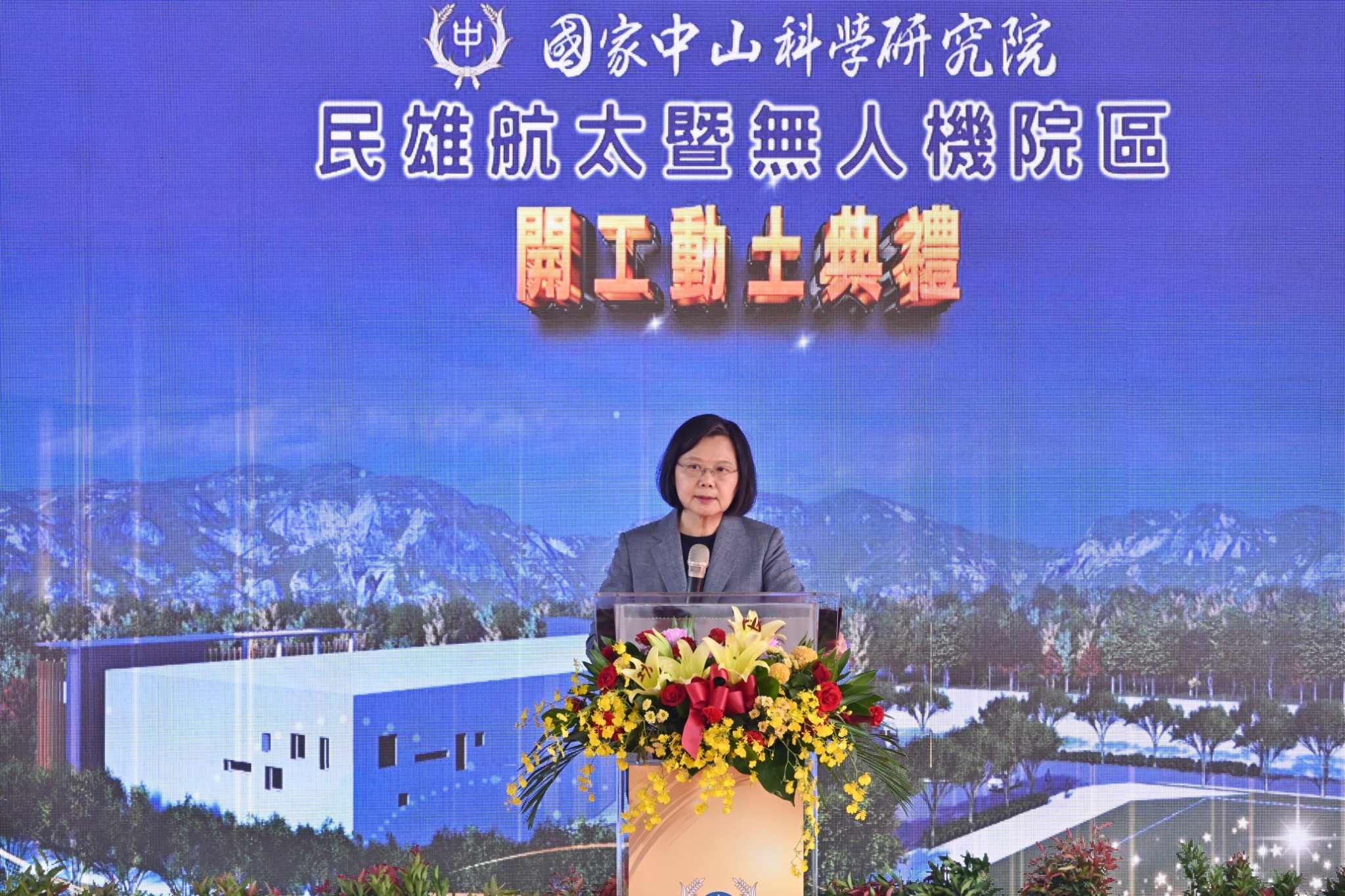 今日開工動土典禮在熱鬧的鑼鼓舞獅表演中展開,蔡英文總統與鄭副院長首先觀看「中科院近年無人機研發成果及民雄航太院區發展願景」影片及聽取張至正建築師工程規劃簡報;致詞結束後,鄭副院長陪同蔡總統、總統府林佳龍秘書長、黃重諺副秘書長、國安會顧立雄秘書長、陳文政副秘書長、國防部邱國正部長、中科院張忠誠院長、航空所齊立平所長、海軍常務次長黃佑民中將、軍備局長林文祥中將、嘉義縣翁章梁縣長、立法院陳明文委員、嘉義縣議會張明達議長、鈺通營造工程股份有限公司黃國芳董事長等貴賓進行祈福祝禱,上香祈求工程順利,執金鏟起鍬三鏟,完成動土儀式,並與貴賓合影留念。