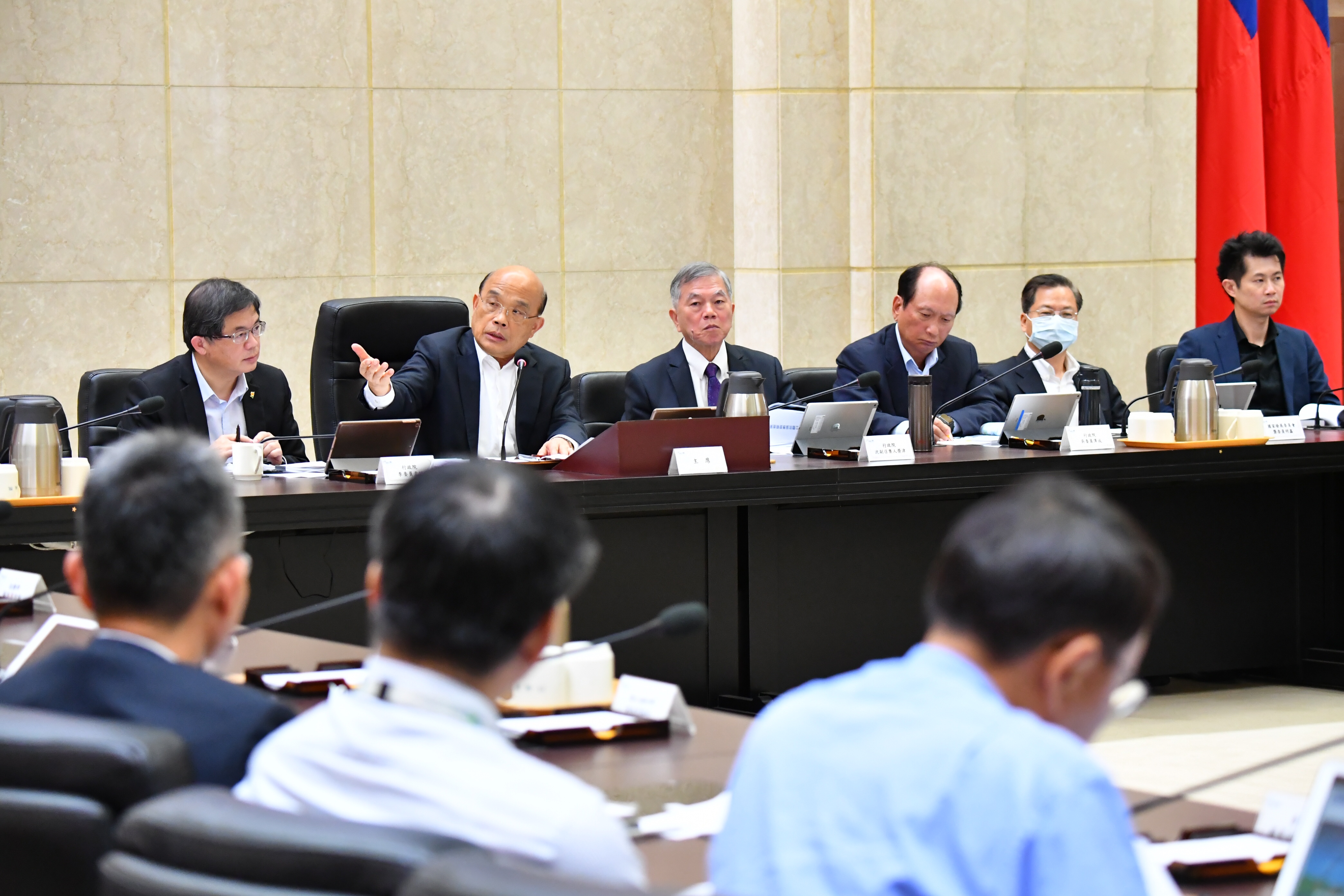 蘇院長進一步指出,近來發生非洲豬瘟及金門牛結節疹等事件,感謝各部會通力合作幫忙,也請農委會、防檢局、海關等應嚴守國境且保護本土種,讓原生本土種能延續留長,這方面要如同防治非洲豬瘟一樣,要人給人,要錢給錢,一定要立刻處理,不能分期;中央、地方全力合作,全國同步、一次將問題解決。院長也特別責成農委會做好防治工作,不要讓全球化的動植物疫災進到台灣來。