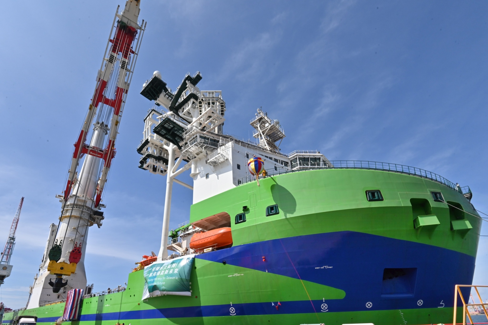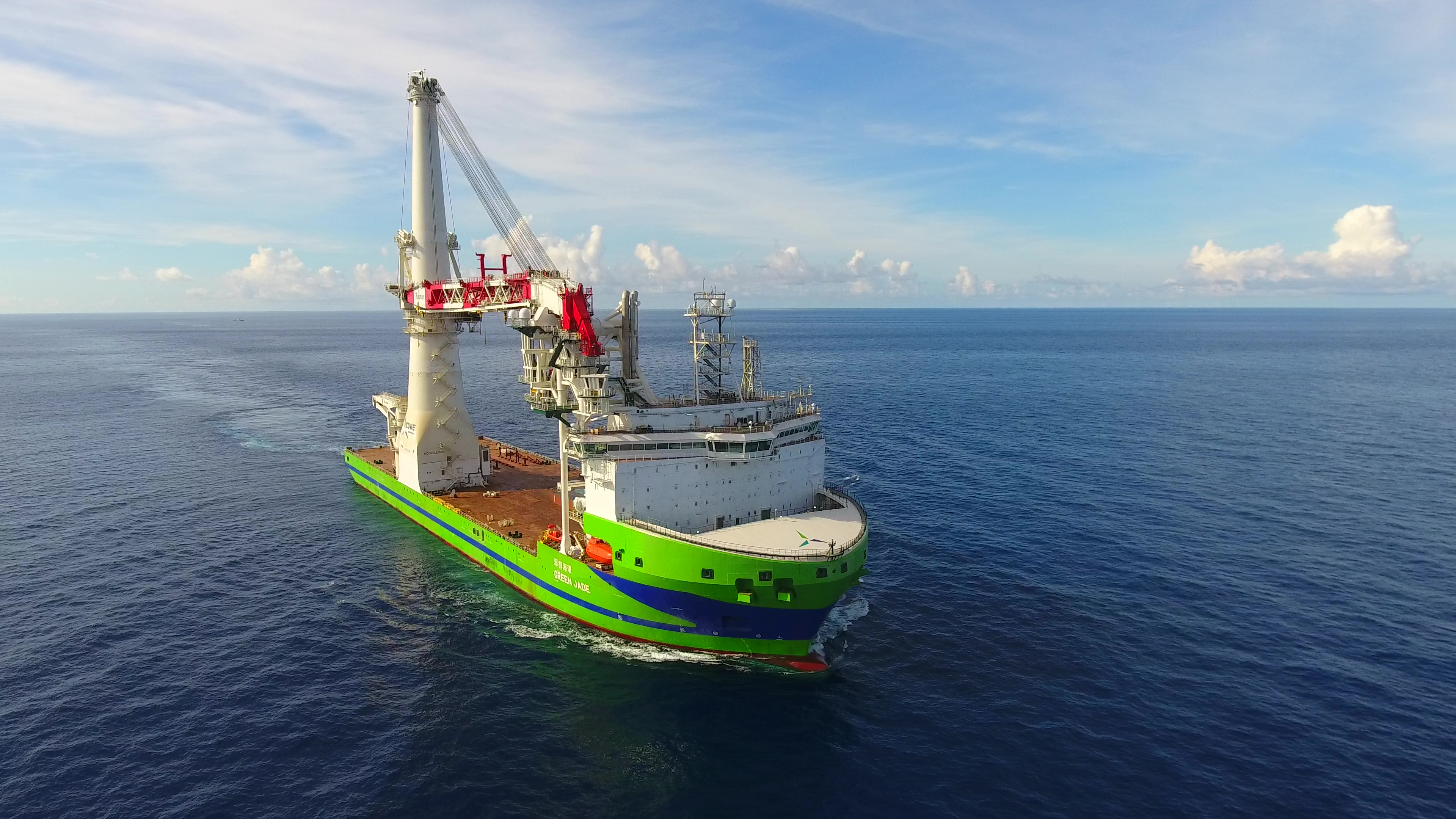 鄭副院長強調,今日交船的「環海翡翠輪」為離岸風電大型浮吊船,全長216.5公尺,寬49公尺,深度16.8公尺,載貨面積8,200平方公尺,相當於1.3座足球場,可載貨物重最多達6萬噸,是臺灣第一艘,也是目前唯一及全球第二大的風電浮吊船。其搭載4千噸等級大型吊車及DP3最高等級精準動態定位系統,可為離岸風場開發商進行新型水下基礎和新世代大型風機之運輸與安裝作業,將可加速臺灣離岸風電綠能產業的建設與發展。