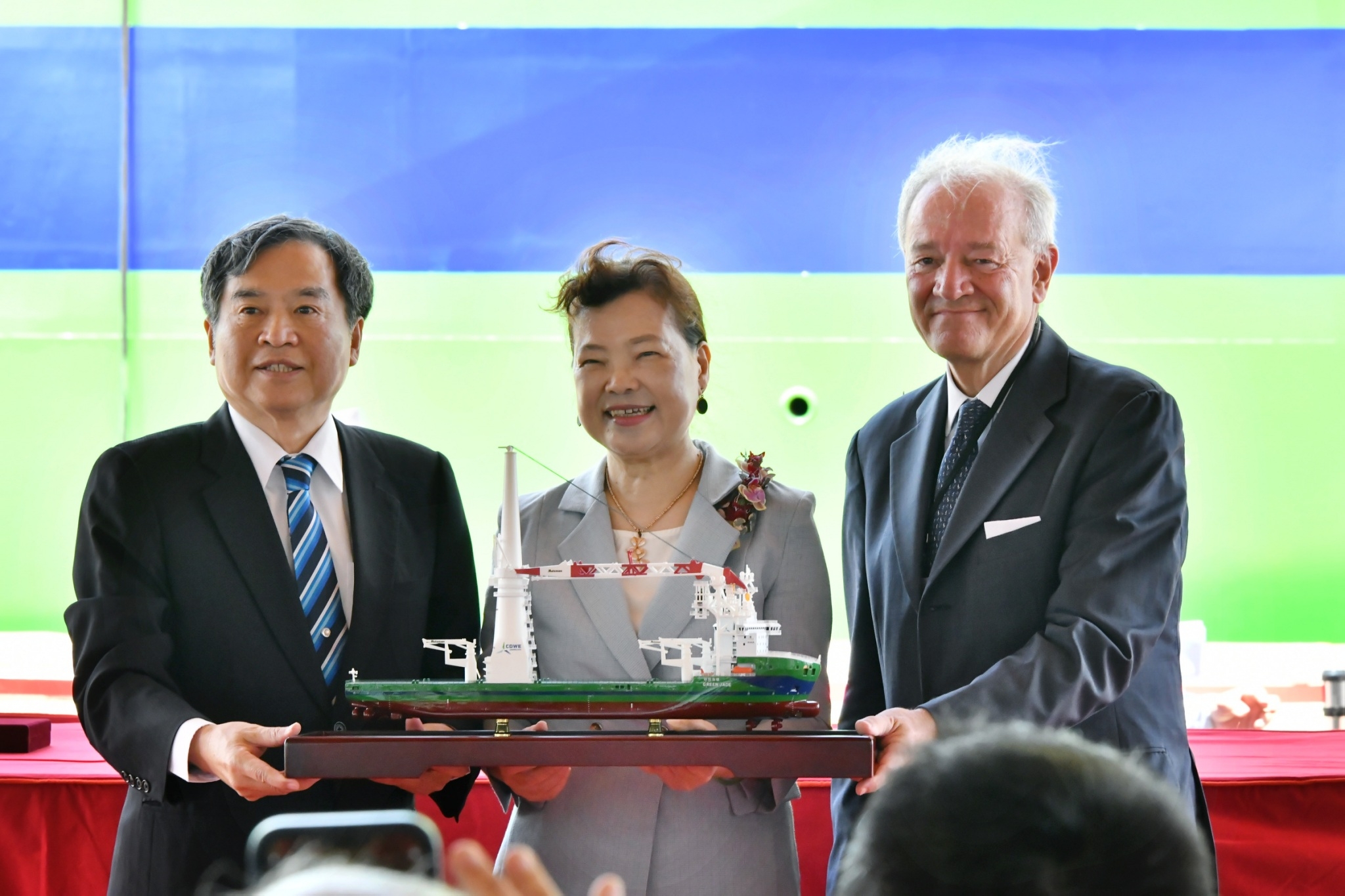 今日交船典禮由鄭副院長主持,經濟部王美花部長擔任命名及擲瓶人,副院長致詞結束後,向與會來賓比利時DEME集團Luc Bertrand 董事長、台船環海公司CEO Marco Kanaar執行長、立法院賴瑞隆委員、林岱樺委員、許智傑委員、海洋委員會洪文玲副主委,台船公司鄭文隆董事長、魏正賜總經理及台船公司企業工會張益得理事長等人揮手致意,現場氣氛熱絡。