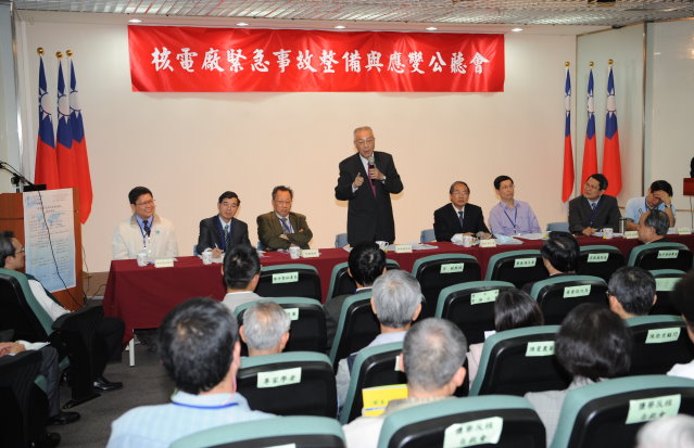 「核電廠緊急事故整備與應變」公聽會由行政院原子能委員會蔡春鴻主委主持,行政院吳院長、秘書長林中森、清華大學李敏教授及潘欽教授、警察大學簡賢文教授、臺大醫院石富元醫院等共同與會。