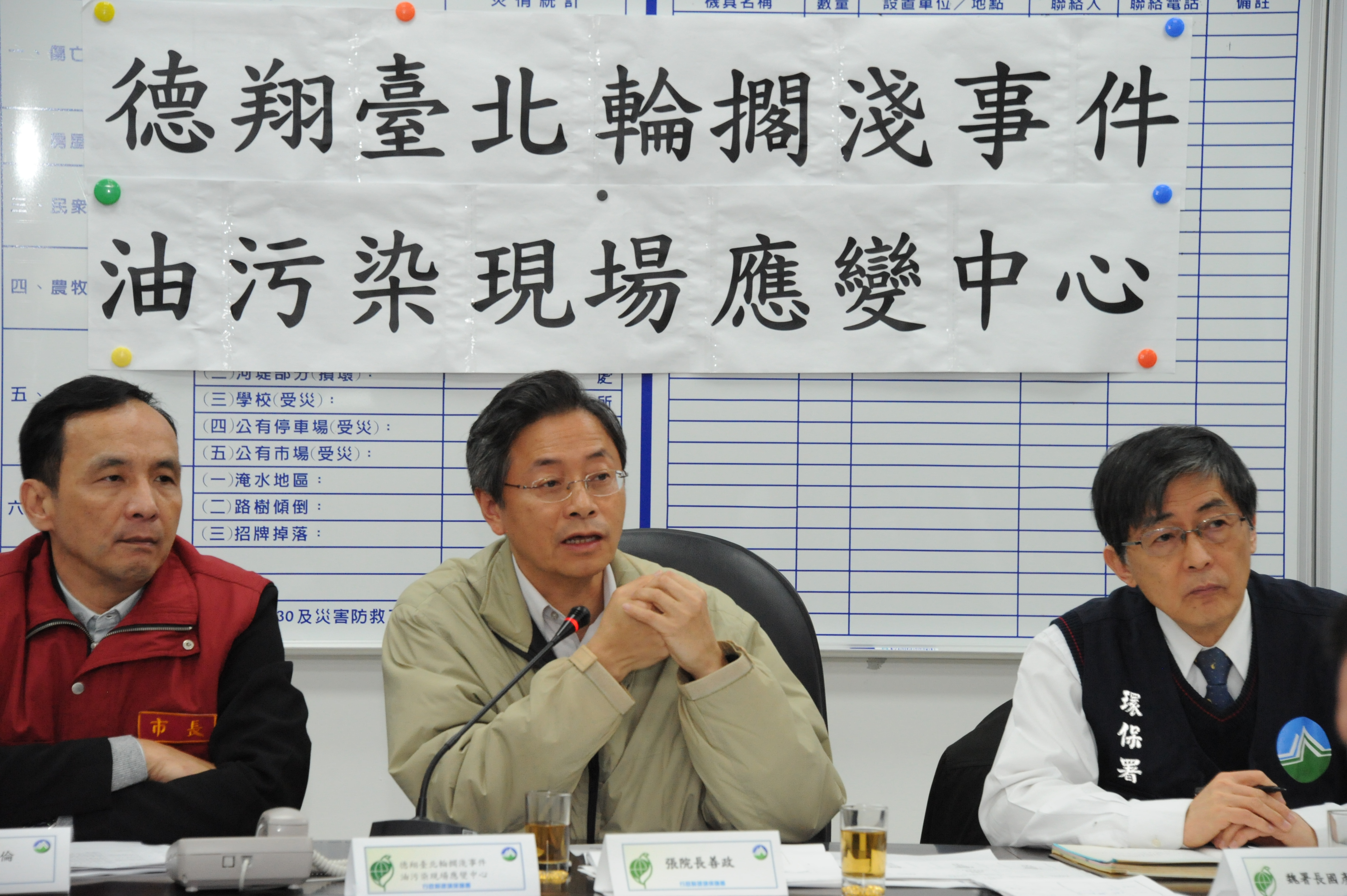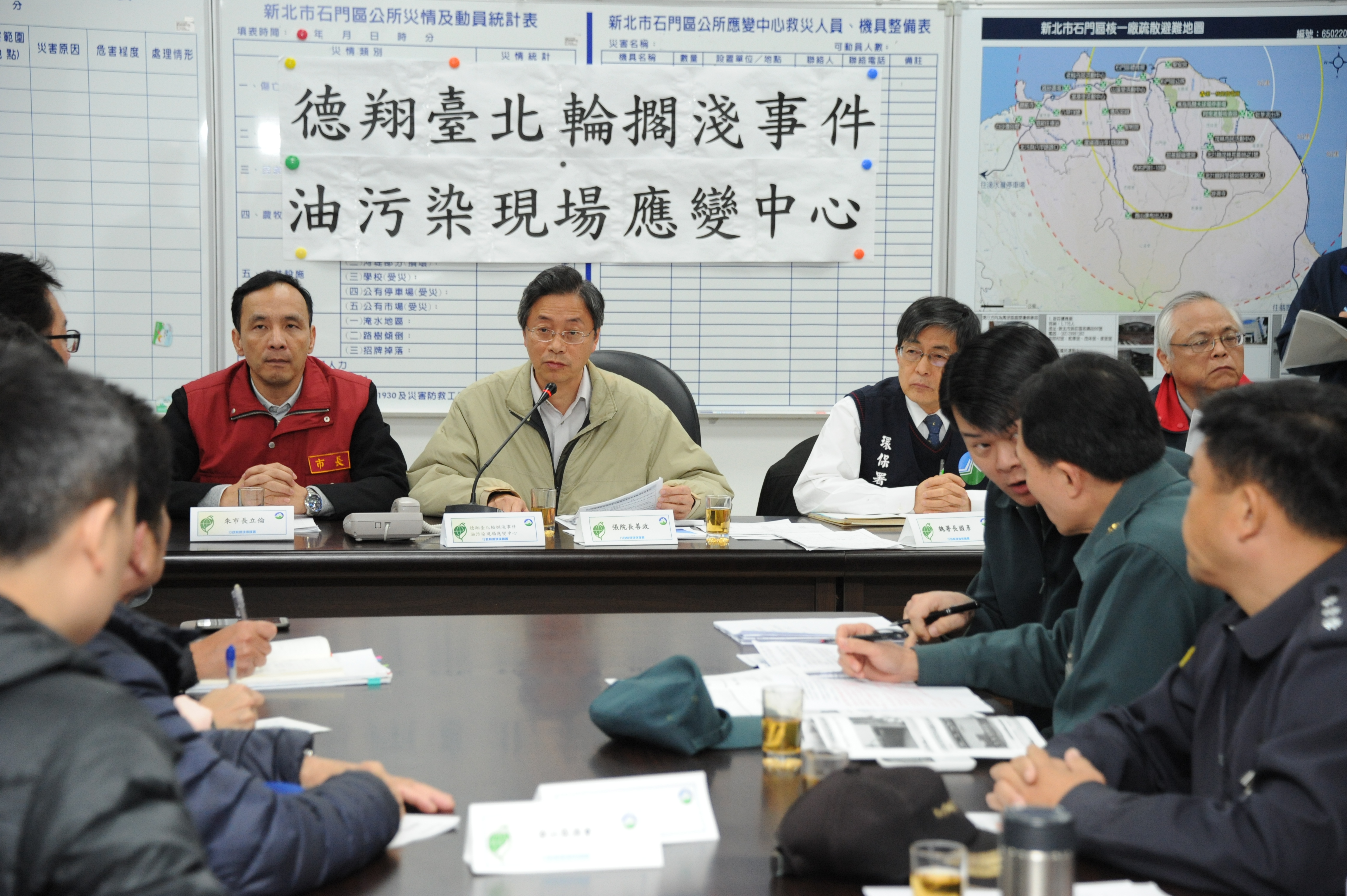 張院長指出,行政院已於昨(24)日由許俊逸政務委員邀集環保署、交通部、農委會等相關部會成立專案小組並召開第一次會議研商,專案小組分為3個小組,第一小組由環保署負責控制與清理殘油污染,第二小組由交通部負責因應貨櫃落海對附近航道的影響,第三小組由農委會處理漁業、觀光損失等後續補償問題;該專案小組,由許政委擔任召集人,並由交通部陳建宇部長、環保署魏國彥署長共同擔任副召集人,並在石門區公所設置前進指揮所,由環保署符樹強副署長擔任指揮官,調度指揮現場相關作業。