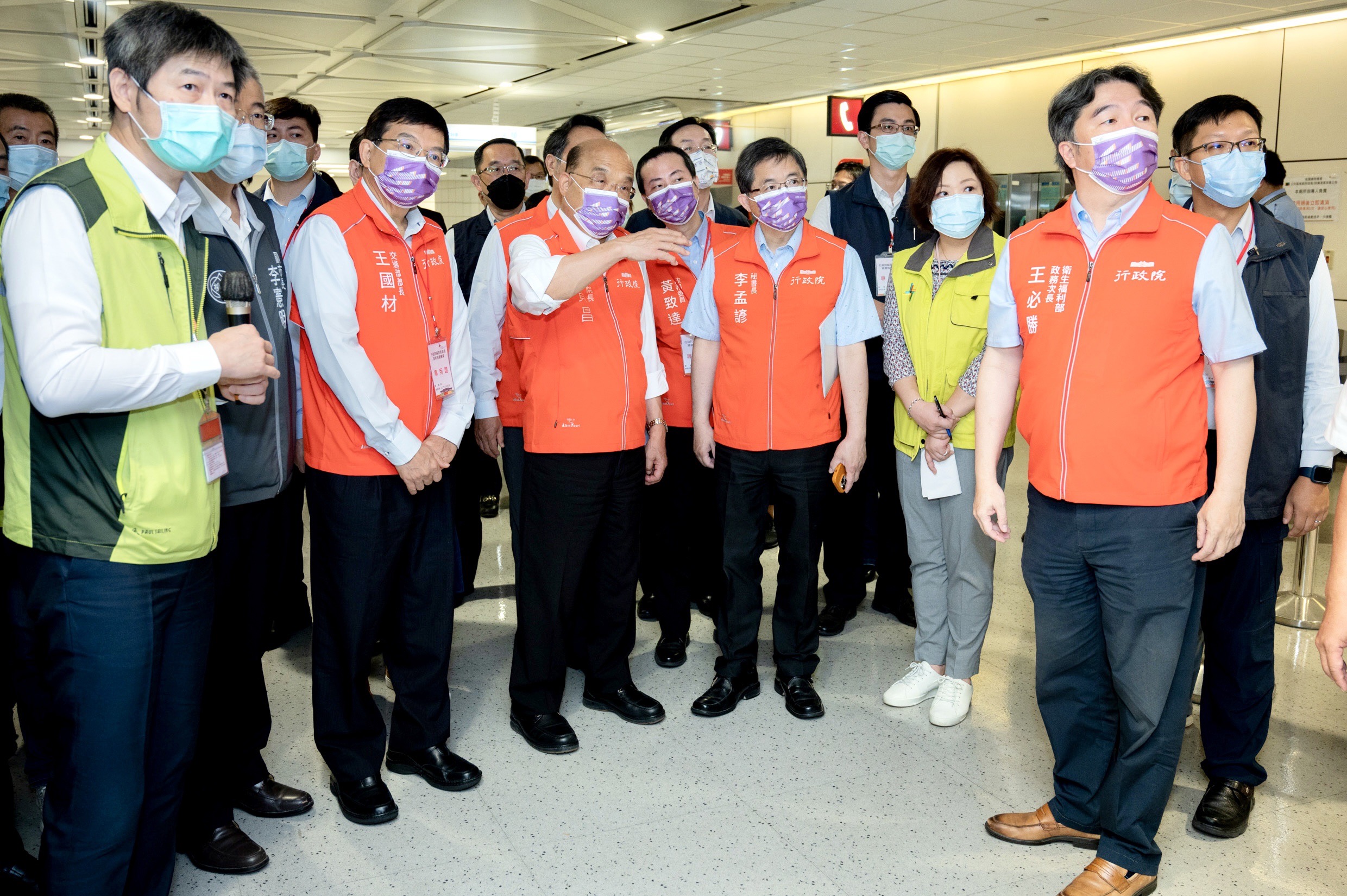 蘇院長此行先聽取衛福部疾管署、桃園機場公司分別報告「因應取消唾篩及提升旅運量政策邊境檢疫作業之調整應變」、「桃園國際機場疏運作業」整備情形,並於致詞後親自前往機場收審單區、發燒篩檢站及海關檢查檯等視察,實地瞭解旅客入境動線。蘇院長視察時一再提醒,因應邊境解封後可能出現大批出入境旅客,機場場地動線、設備、人力等各項軟硬體皆須預先妥善整備,並設身處地為旅客著想,積極提高旅客通關及行李檢查的效率及便利性。