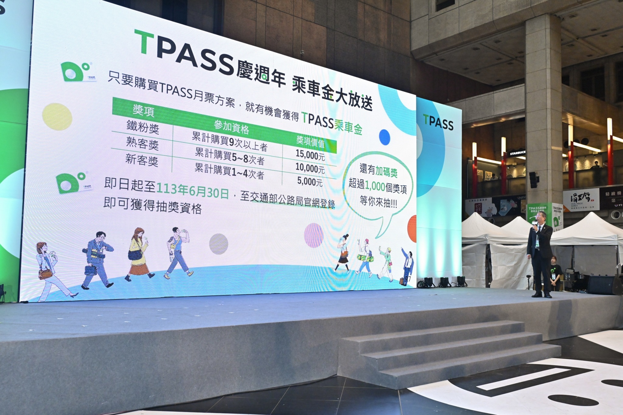 陳院長進一步表示,「TPASS行政院通勤月票」接下來即將邁入實施的第2年,為鼓勵民眾多加使用,交通部公路局特別規劃此次「TPASS慶週年 乘車金大放送」抽獎活動,民眾只要自全國各通勤月票開始販售至今年6月30日止,期間曾加值購買全國任一種通勤月票,即可上網登錄報名參加,並有機會抽中TPASS乘車金。