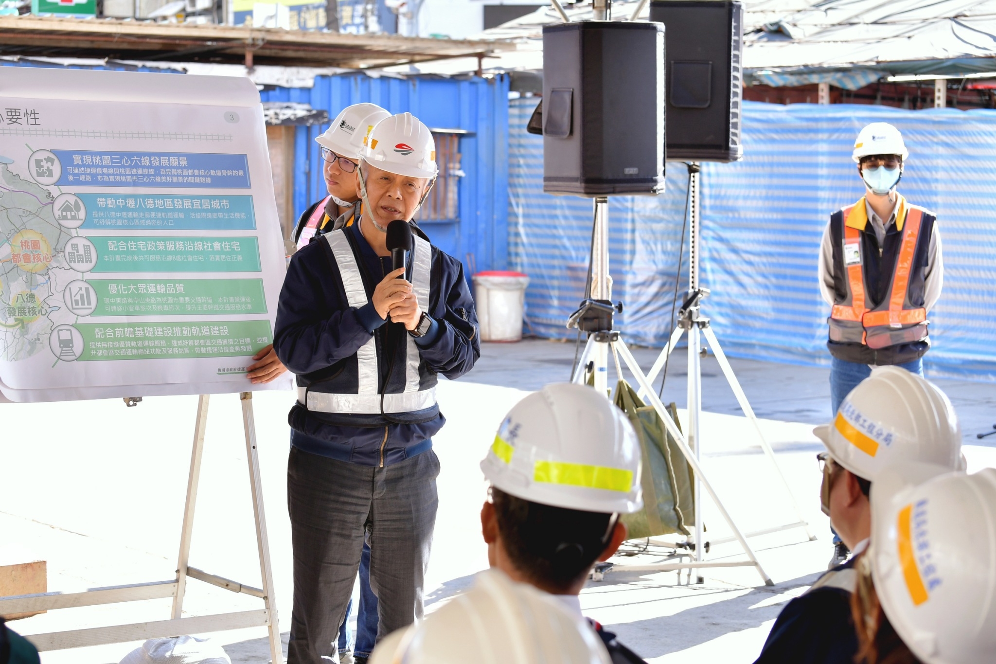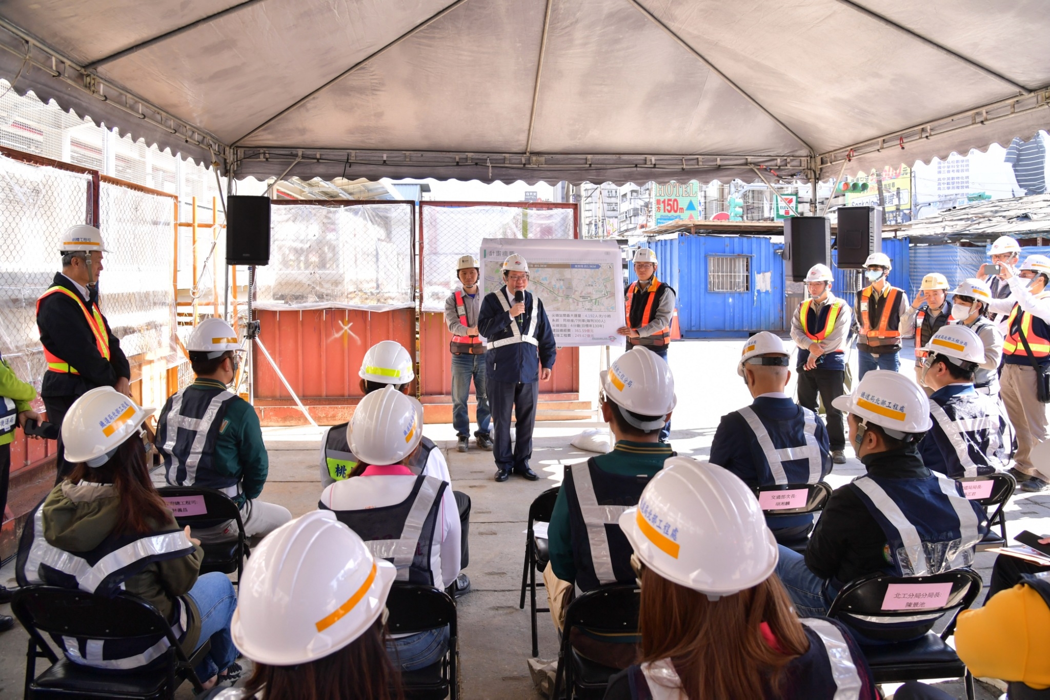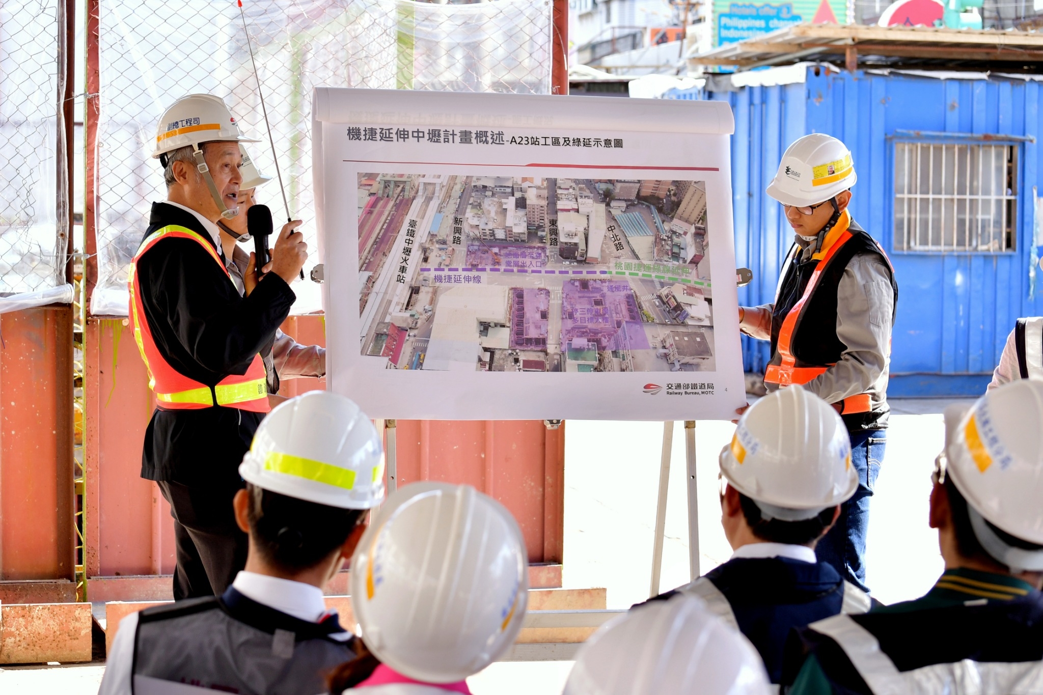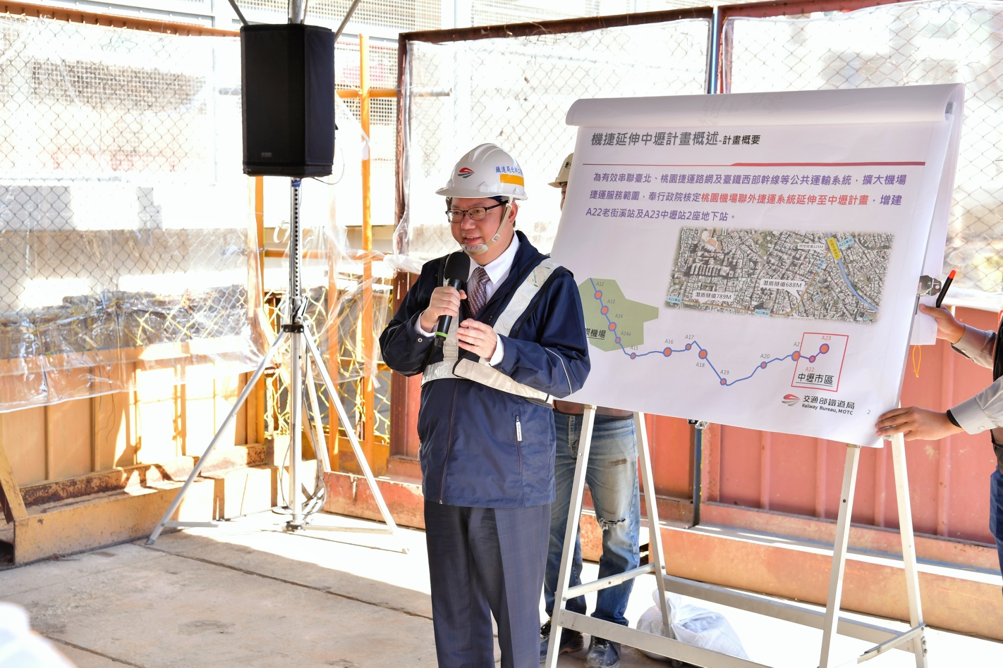 鄭副院長扺達視察現場後,首先聽取桃園捷運局簡報規劃內容及A23站擴建大月台方案,接著由交通部鐵道局簡報說明機場捷運A23工程執行現況及配合桃園綠線延伸中壢A23站擴建大月台方案辦理情形,接著前往視察工地。今日出席人員包括交通部胡湘麟次長、鐵道局楊正君局長、桃園市政府詹榮鋒秘書長及桃園市議會彭俊豪議員、魏筠議員、王珮毓議員、許家睿議員、劉仁照議員、張曉昀議員、黃崇真議員等皆到場關心工程進度。