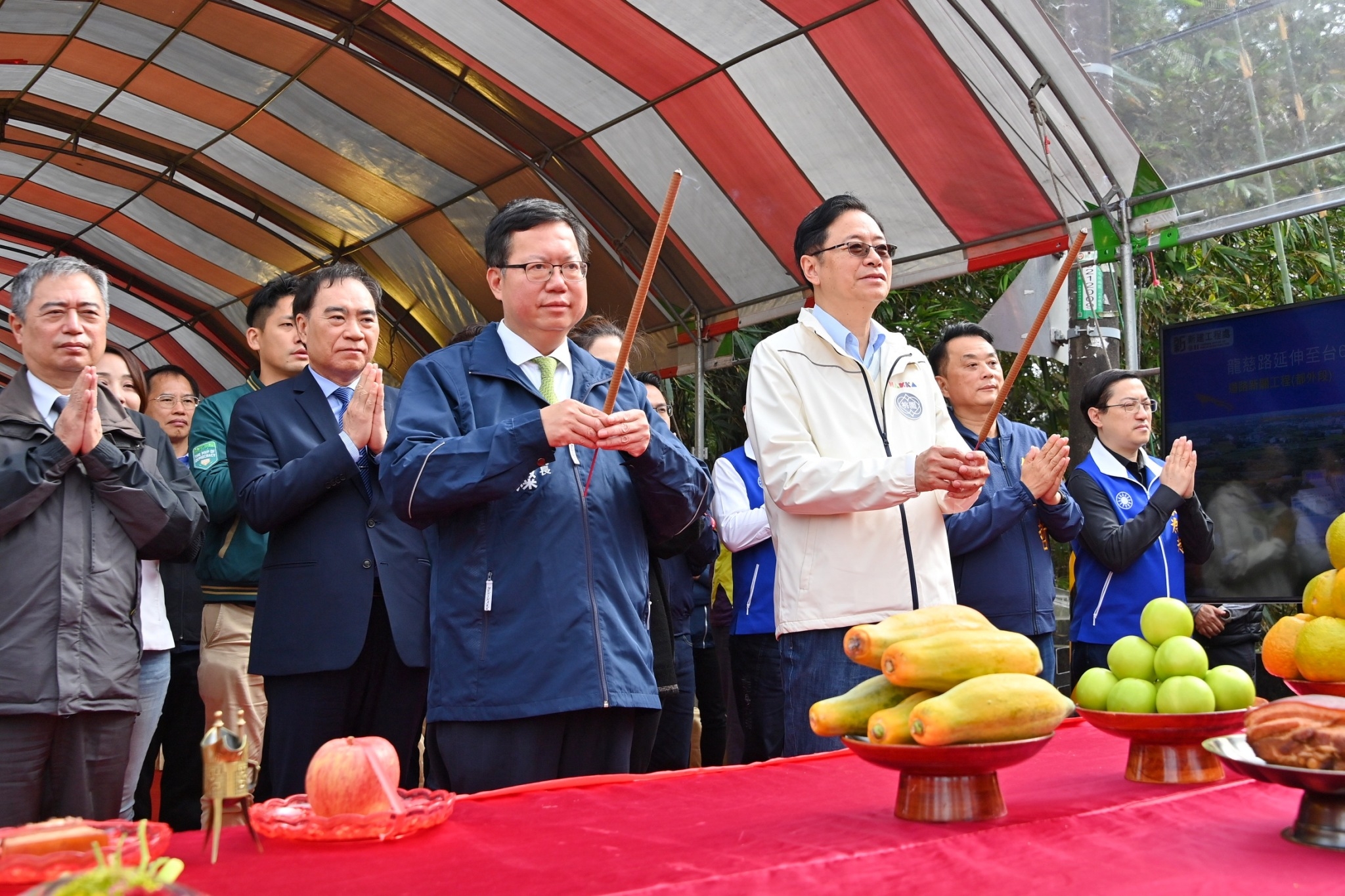 鄭副院長抵達開工動土典禮後,首先觀賞祥獅獻瑞的表演,致詞後,與桃園市張善政市長一同主持動土祭祀儀式,隨後與內政部吳容輝政務次長、立法院魯明哲委員、呂玉玲委員、桃園市議會王珮毓議員、彭俊豪議員、吳嘉和議員、黃敬平議員、陳韋曄議員、舒翠玲議員、梁為超議員、劉仁照議員、魏筠議員一起執起金鍬,起鍬三鏟,祈求工程順利圓滿並合影完成整個儀式。