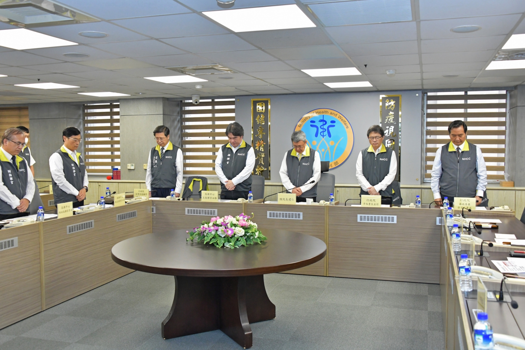 陳院長抵達指揮中心後,即與現場所有部會同仁為感染COVID-19逝者默哀;隨後,院長聽取衛福部疾病管制署莊人祥署長報告「指揮中心解編後整備工作」,並由王必勝指揮官補充說明國內疫情現況。
