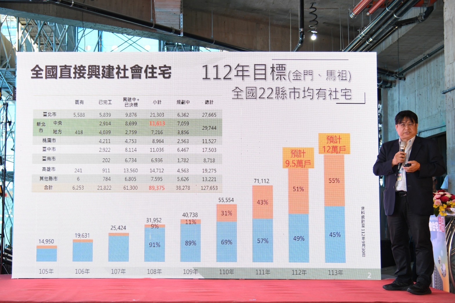 陳院長表示,蔡英文總統上任後,持續關心居住正義議題,並提出8年興辦20萬戶社會住宅的政策目標,其中12萬戶為直接興建、8萬戶為包租代管,預計明(2024)年底即將達標。院長強調,興建社會住宅需要中央與地方密切配合,他十分欣見內政部與新北市政府未來持續共同合作,興建更多社會住宅,以嘉惠更多民眾。