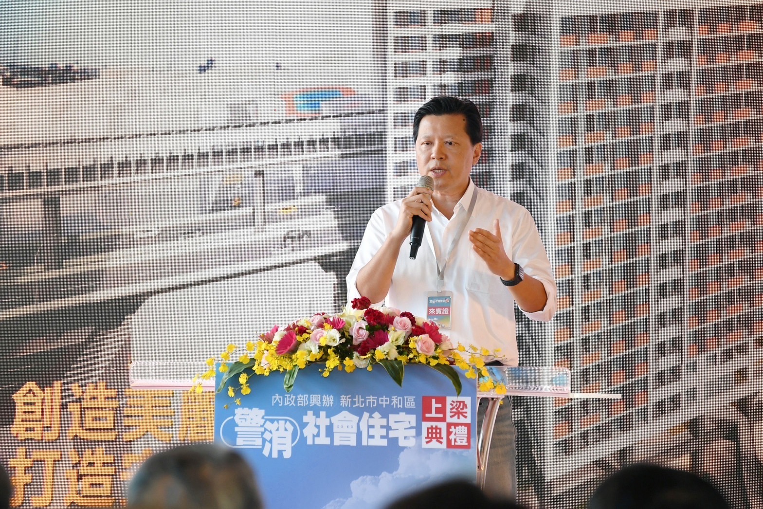 陳院長進一步指出,繁重的勤務常使得同仁無法維持正常生活作息,因此由中央興辦「警消社會住宅」是再恰當不過,他很高興今日前來參加新北市中和區警消社宅的上梁典禮,祝福工程順利成功、如期如質完成。未來完工後,也將優先提供給基層警消同仁申請,希望為警消同仁提供安全、舒適、放鬆心情、安居樂業的居住環境。