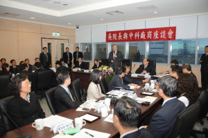 吳院長今日是由行政院秘書長林中森、國科會主委李羅權、經濟部次長林聖忠、財政部次長張盛和及金管會銀行局長桂先農等人的陪同下,在中科管理局與中科園區廠商座談。(E)