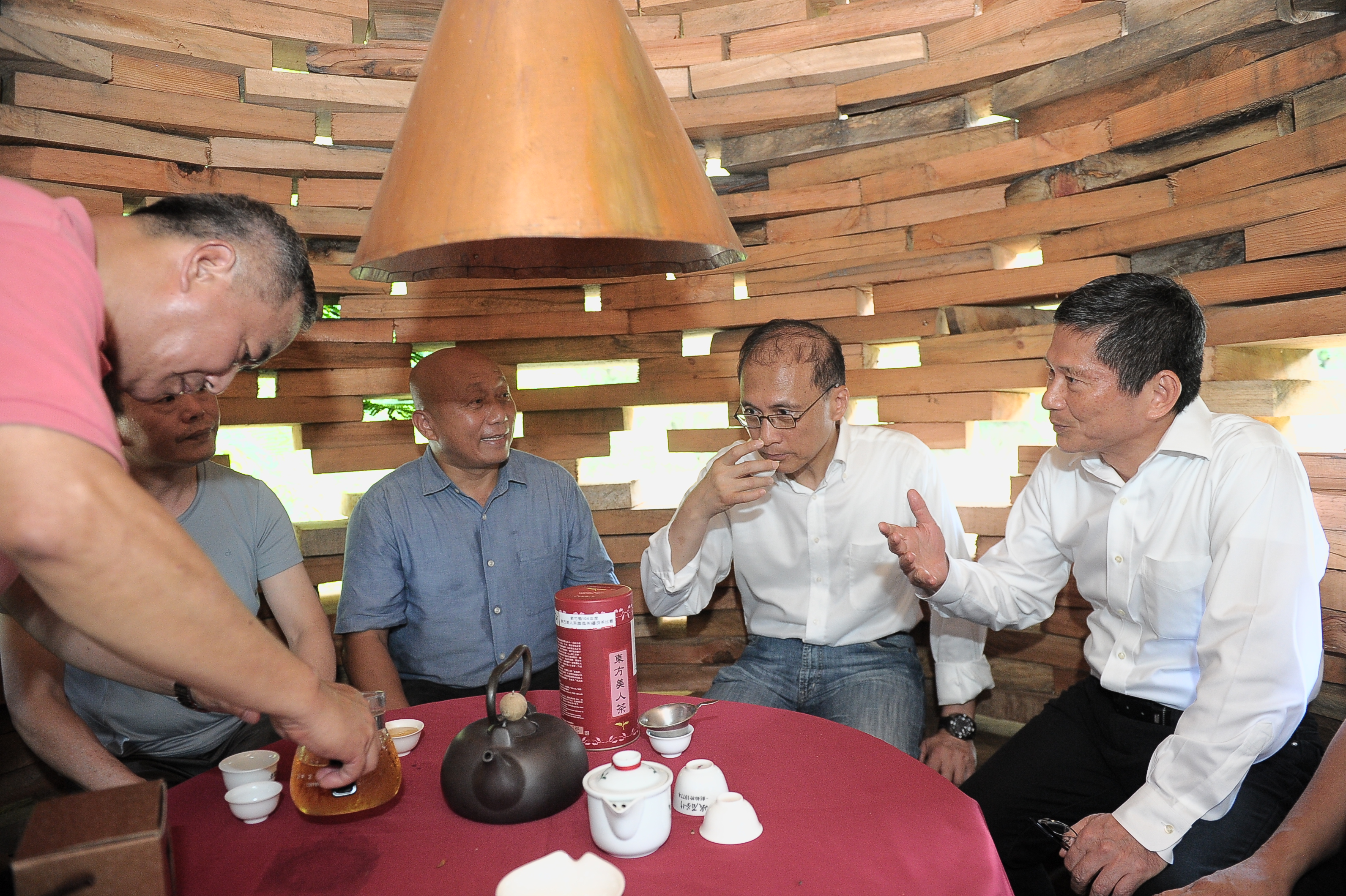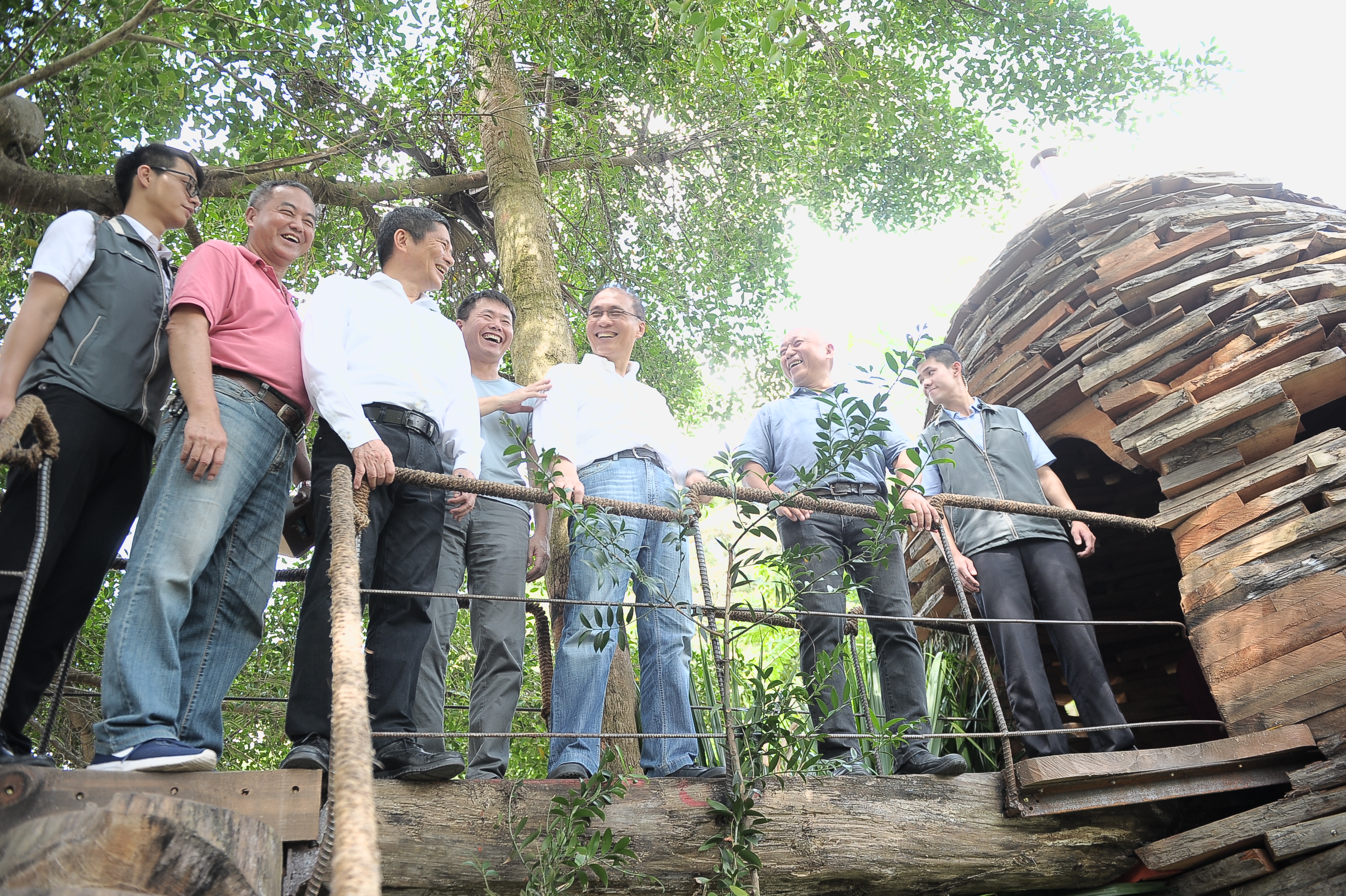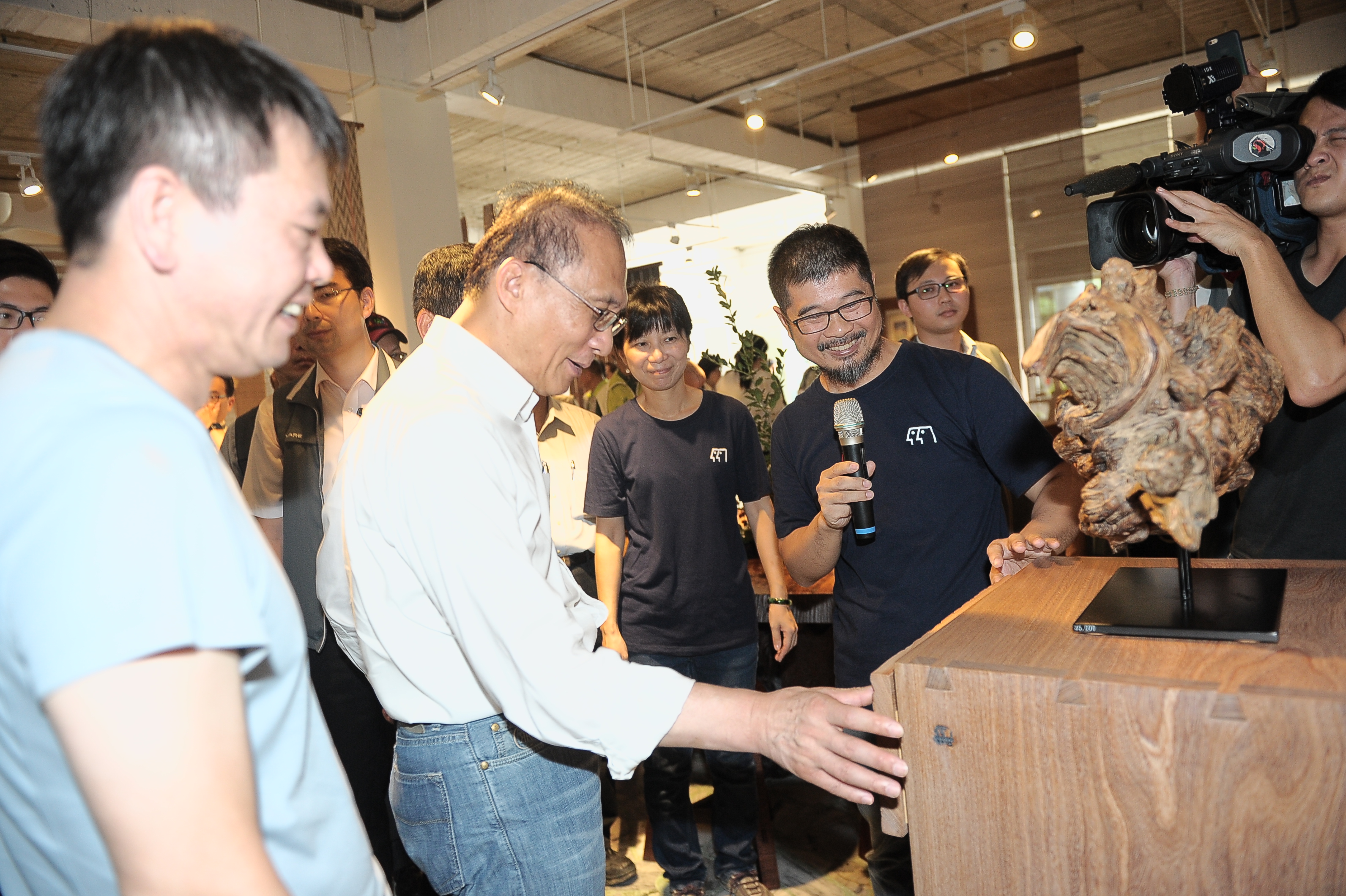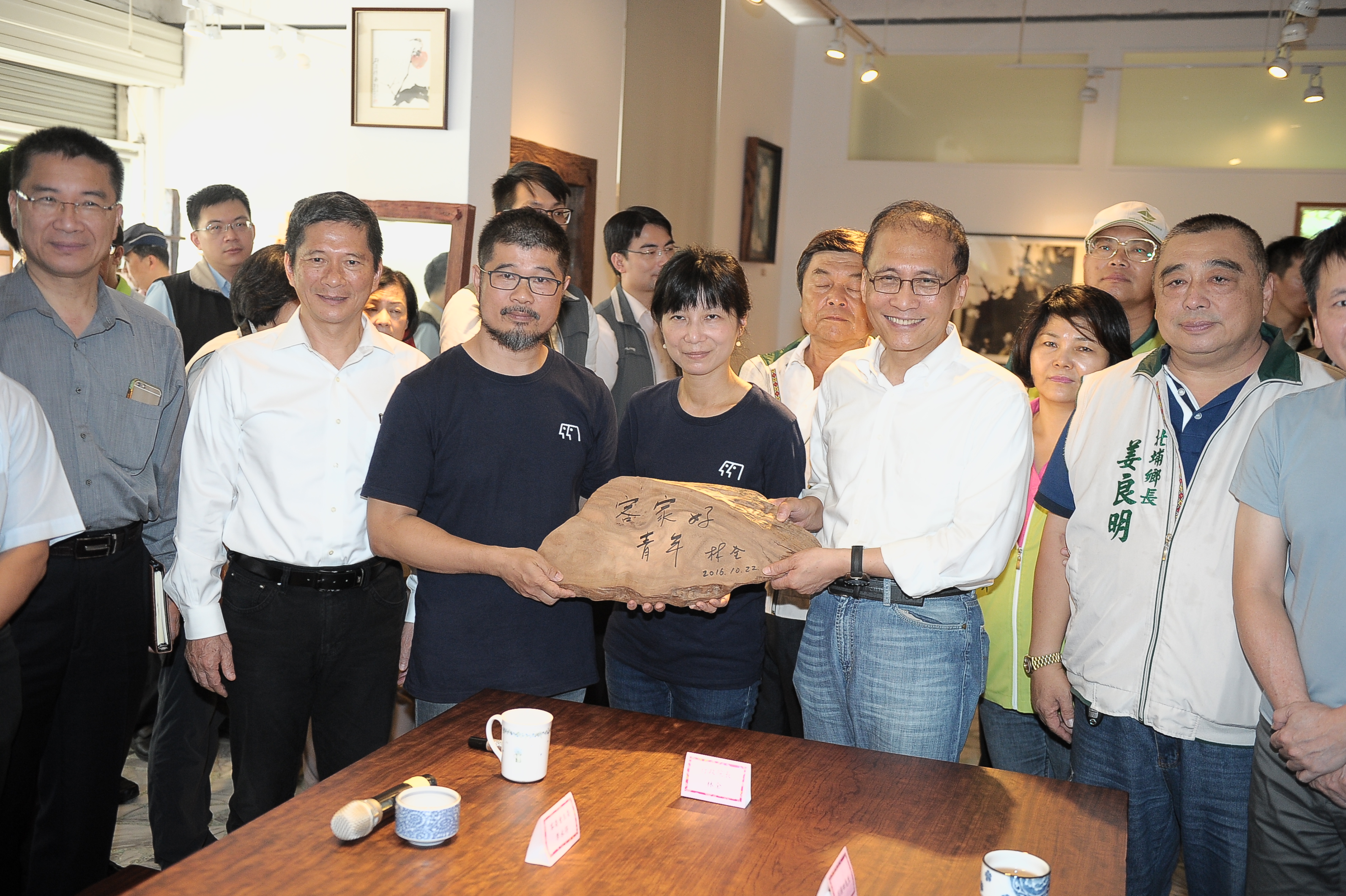隨後,林院長至木器傢俱工作室--意念工房參訪,瞭解主人范揚田先生的經營歷程與設計理念,並在臺灣形狀木匾題字「客家好青年」表達祝願;另亦前往峨眉天主堂參觀茶屋地景藝術。