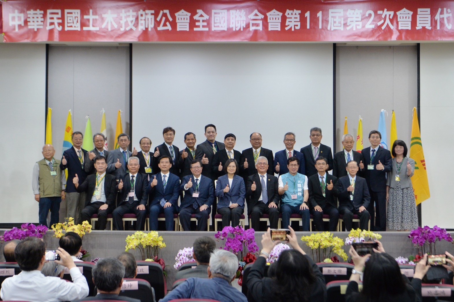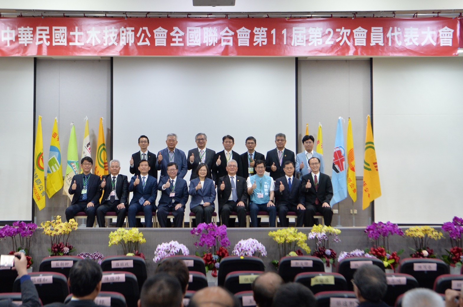 蔡總統與鄭副院長到場後,先與所有出席貴賓於座位上大合影,隨後觀賞總統歷年參與土木技師公會全國聯合會活動的珍貴紀錄影片。致詞結束後,總統與副院長也分別與土木技師公會全國聯合會、各土木公會理事長及理監事合影留念。