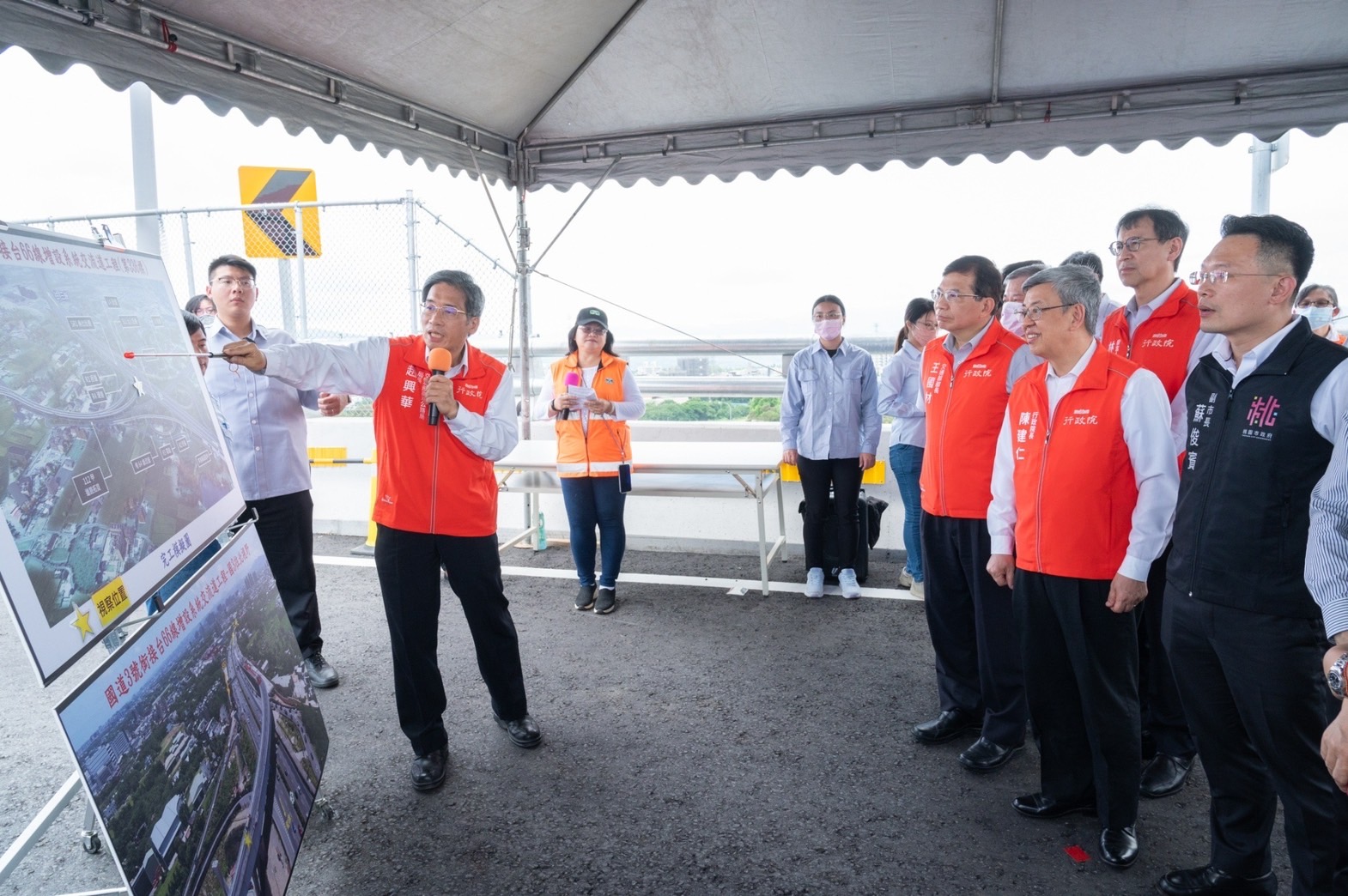 最後,陳院長感謝所有參與同仁和施工團隊,施工期間正逢COVID-19疫情,克服缺工、缺料的困難,甚至超前進度,戮力完成,他預祝通車順利,並期許後續工程如期如質完成。此行,陳院長首先聽取交通部高速公路局趙興華局長簡報「國道3號銜接台66線增設系統交流道」,瞭解工程情形、成果及效益,隨後在趙局長陪同解說下,進行現地視察,並與現場貴賓及施工團隊合影留念。