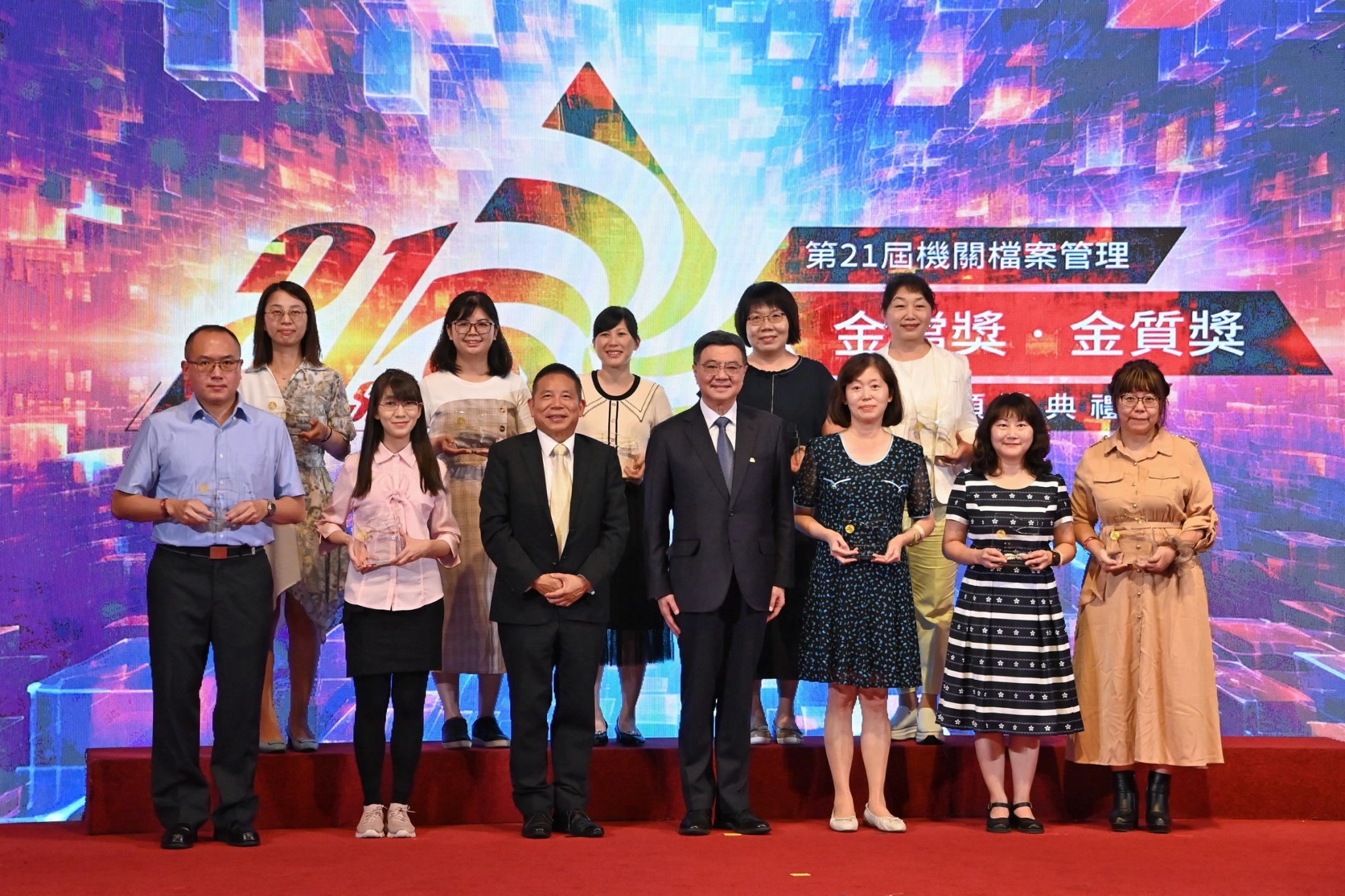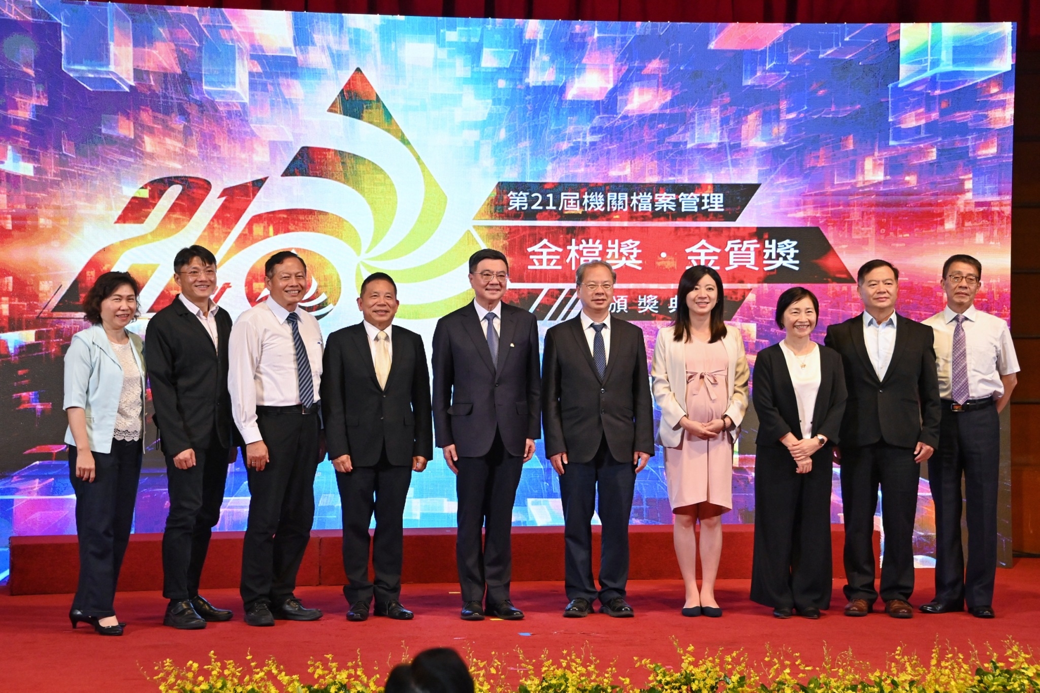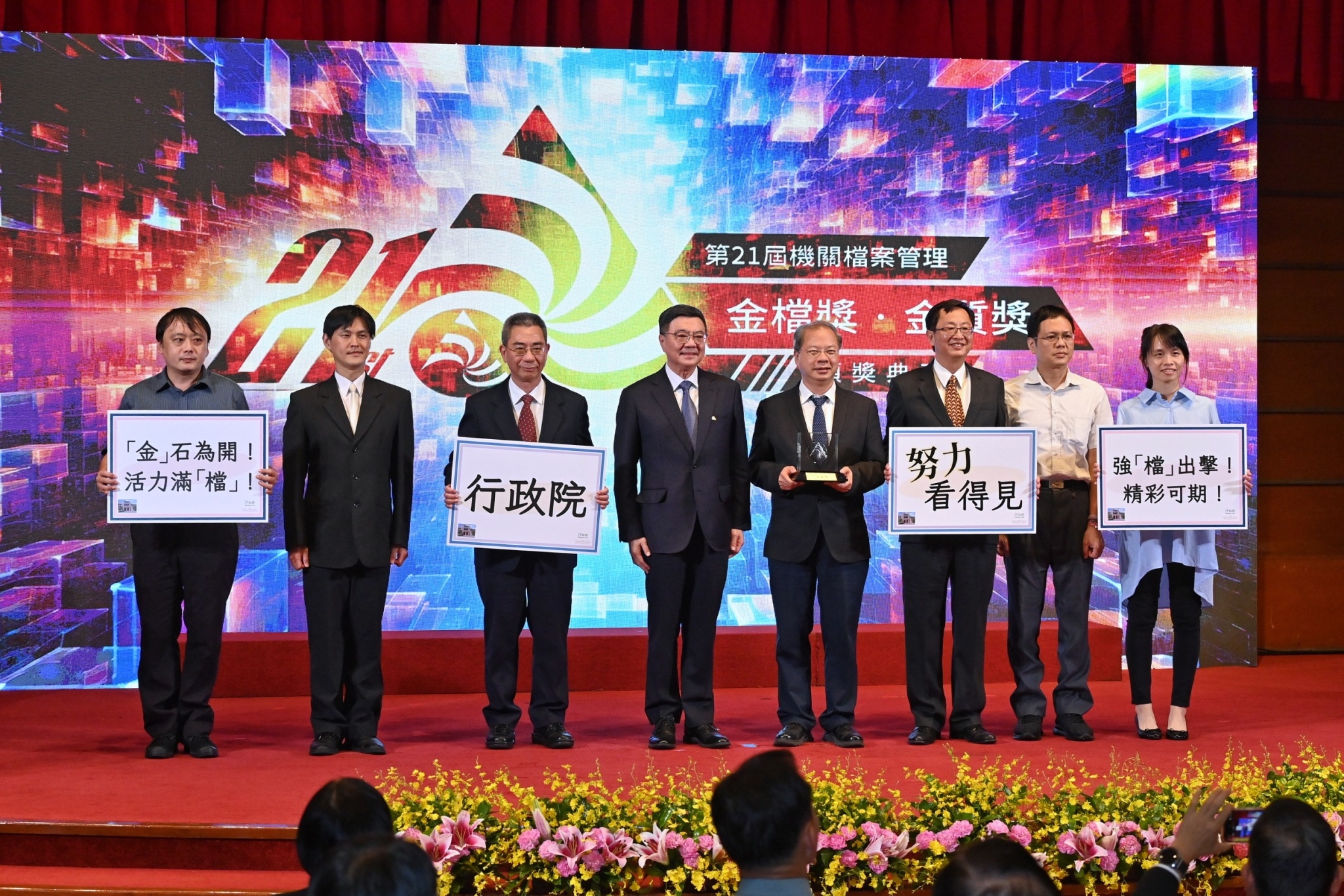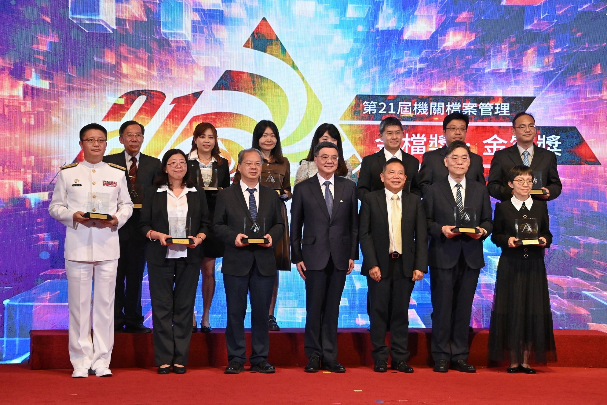 此行,卓院長到場後,首先欣賞開場光雕立方表演,並在致詞結束後,分別頒發金檔獎及金質獎獎座予得獎機關代表與同仁,各機關同仁也持該機關標語與卓院長合影留念;隨後,卓院長與行政院龔明鑫秘書長、謝子涵代理發言人、李國興副秘書長、國家發展委員會劉鏡清主委、國防部楊基榮次長,以及評獎委員國發會檔案管理局林秋燕局長、陳美蓉副局長、陳海雄副局長、謝焰盛主任秘書、國立政治大學圖書資訊與檔案學研究所薛理桂名譽教授、國防大學管理學院資源管理及決策研究所張臺衞副教授一同合影。