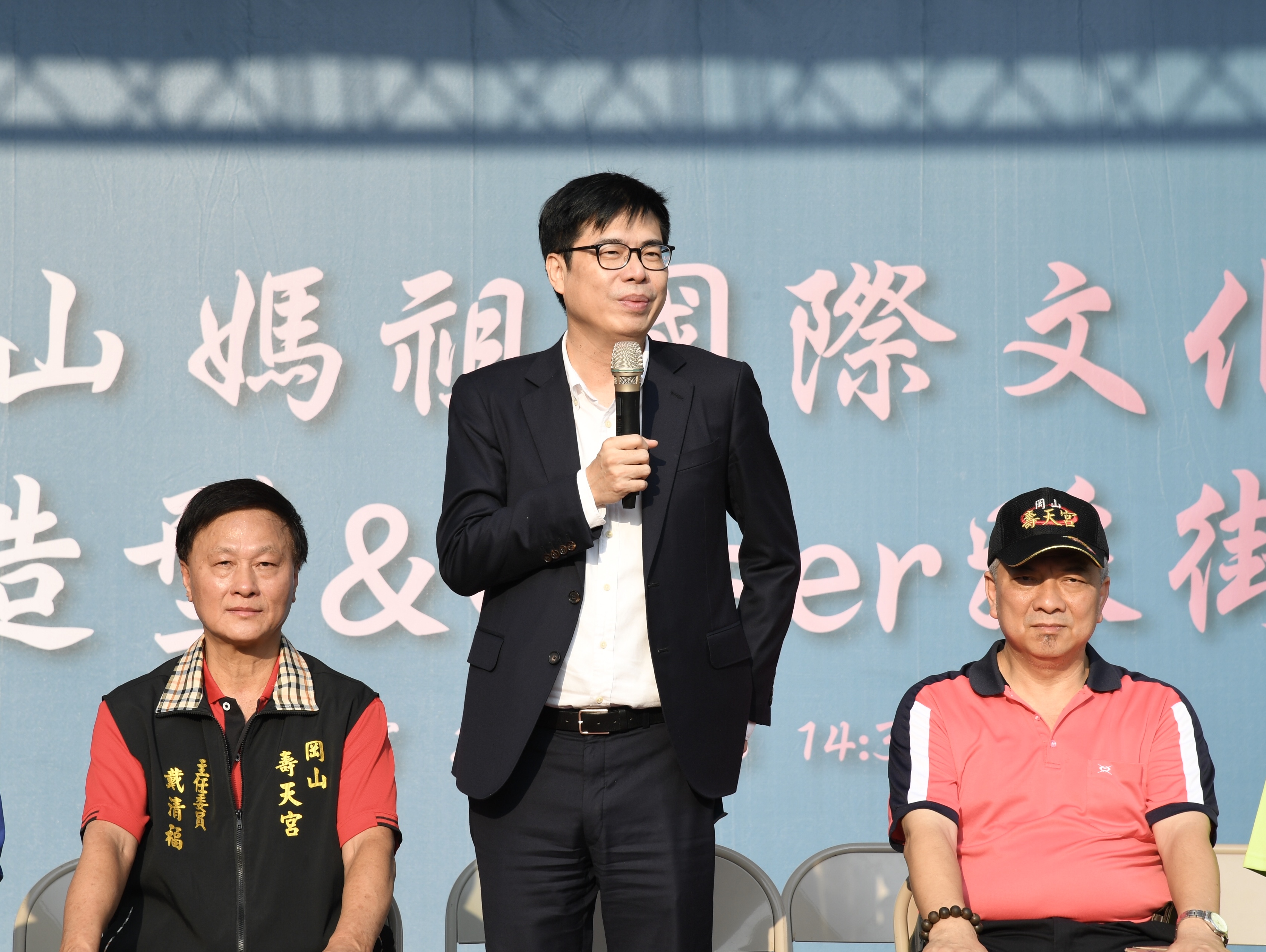陳其邁結束太極拳錦標賽行程,接著到岡山壽天宮參加媽祖國際文化豐遊季,他非常開心已連續兩年參與這項岡山的信仰文化的大活動,同時高度肯定岡山壽天宮長期以來秉持媽祖救苦救難的精神,投注心力推動公益慈善及社會教化事業上的成果,他感謝壽天宮為了推廣媽祖文化並促進螺絲產業活化,每年都舉辦系列特色活動,甚至曾打造全球獨一無二的「螺絲媽祖」,轟動全台,積極協助推廣與創造岡山產業文化特色。