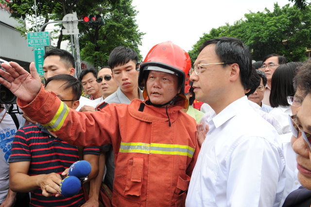 昨(31)日深夜高雄市發生多起氣爆火災,行政院長江宜樺今(1)日赴高雄災害現場及高雄市災害應變中心視察,瞭解救災情形,並前往高雄市五權國小前進指揮中心、高雄醫學院附屬醫院及高雄市榮民總醫院探視災民及受傷民眾。