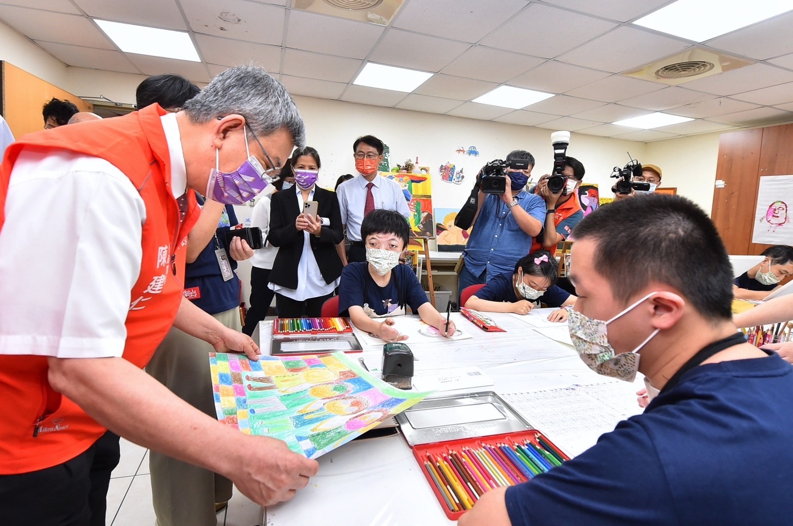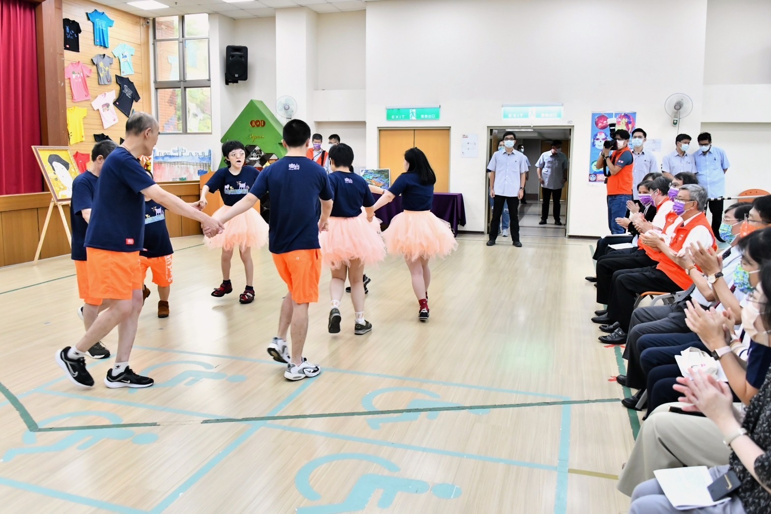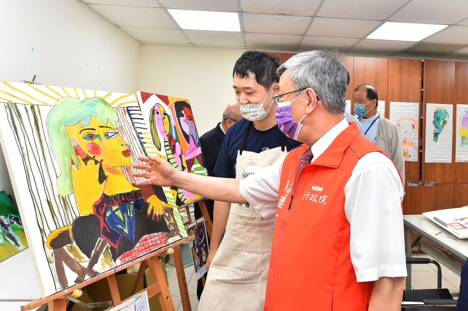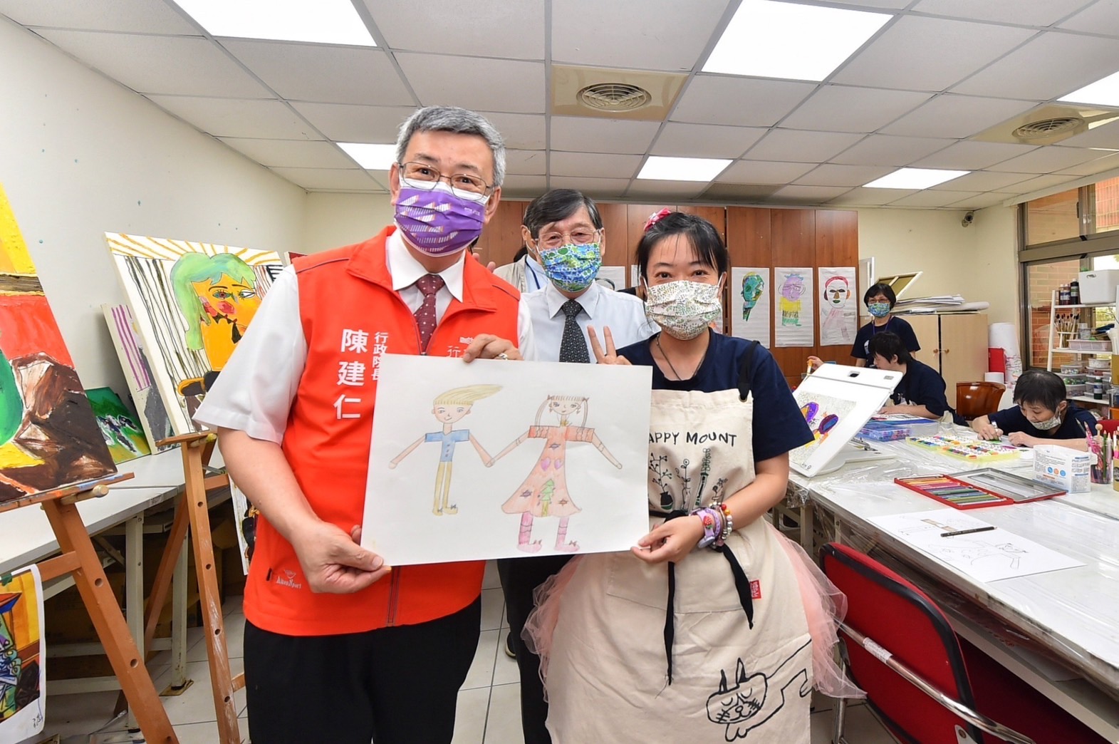 此行,陳院長首先觀賞樂山教養院院生天使的開場舞蹈表演,以及教養院簡介影片《我們之間的天使》;致詞結束後,陳院長致贈加菜金,由樂山教養院張嘉芳院長代表受贈並合影留念;隨後,在張院長導覽下,院長逐一參觀「體適能室」、「多感官教室」、「愛護班」及「繪畫教室」,實地了解院生天使的體能、感官訓練場域、多重障礙者肢體復健輔具運用及繪畫創作課程進行情形,並欣賞院生天使畫作,與院生天使互動熱絡。