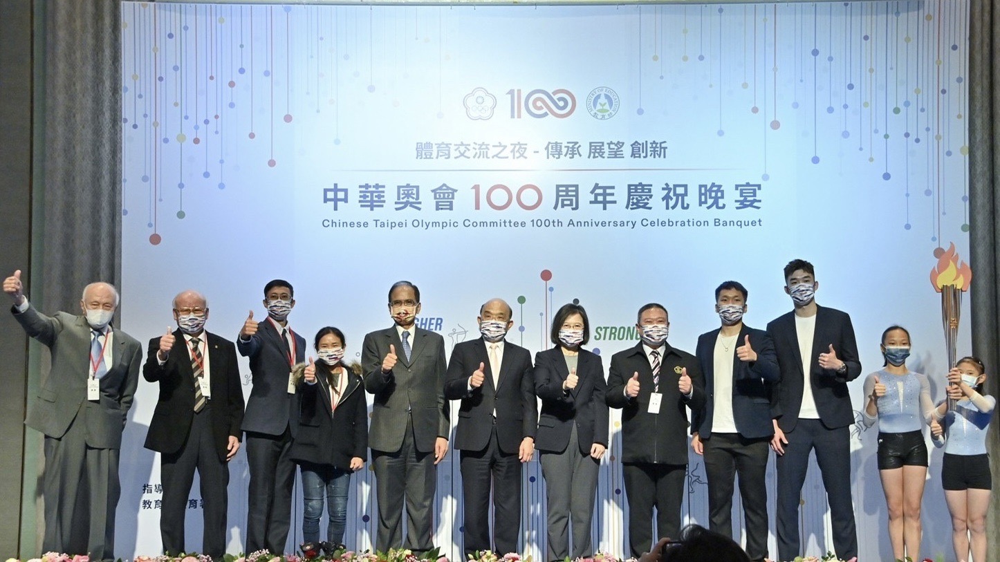 行政院長蘇貞昌今(9)日與蔡英文總統共同出席「傳承 展望 創新 中華奧會100週年慶祝晚宴」,蘇院長並感謝中華奧會擔任我國與國際奧會的橋梁及聯繫窗口,讓臺灣優秀的體育選手得以在奧運的國際場合上出賽,一展長才、揚眉吐氣,更為臺灣在世界爭得一席之地。而蔡英文總統上任後即大力支持國內體育發展,從法制、預算、建置訓練場館到選手培訓等,希望為選手布置好舞臺,讓他們演出精彩,至盼所有選手持續努力在國際賽事上爭取好成績,讓國人同胞和臺灣被世界看見與肯定。