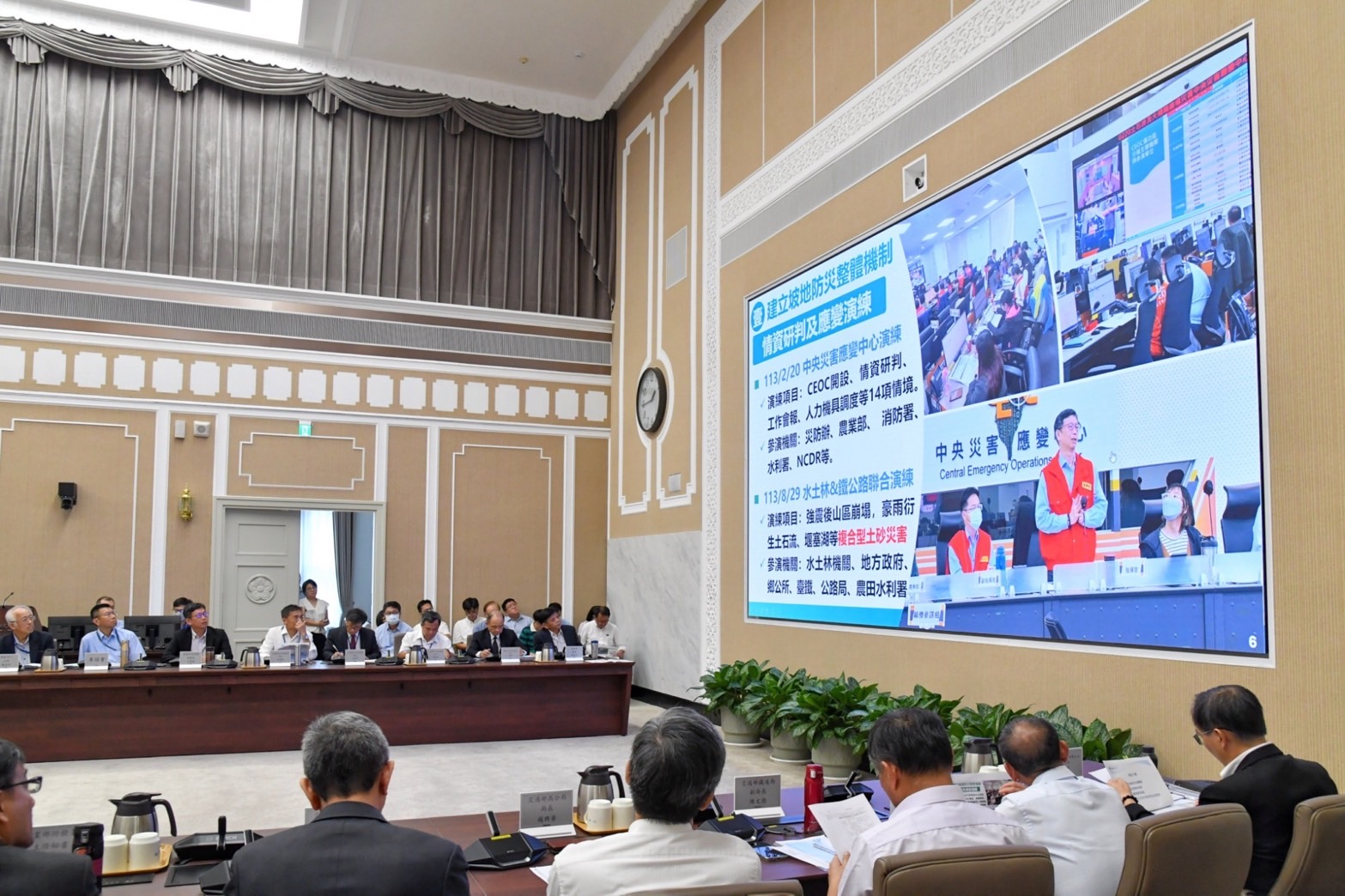 卓院長最後強調,與大自然共處是我們必經的考驗,唯有做好準備,才能保障人民生命財產,這也是政府必要的責任與工作,因此他相當重視中央災害防救會報,期盼各部會針對現階段各項討論與決議內容,加以防範和準備。一旦災害發生時,發揮跨部會整合功能,透過各種科技協助,即時降低災害侵害,使人民安心。