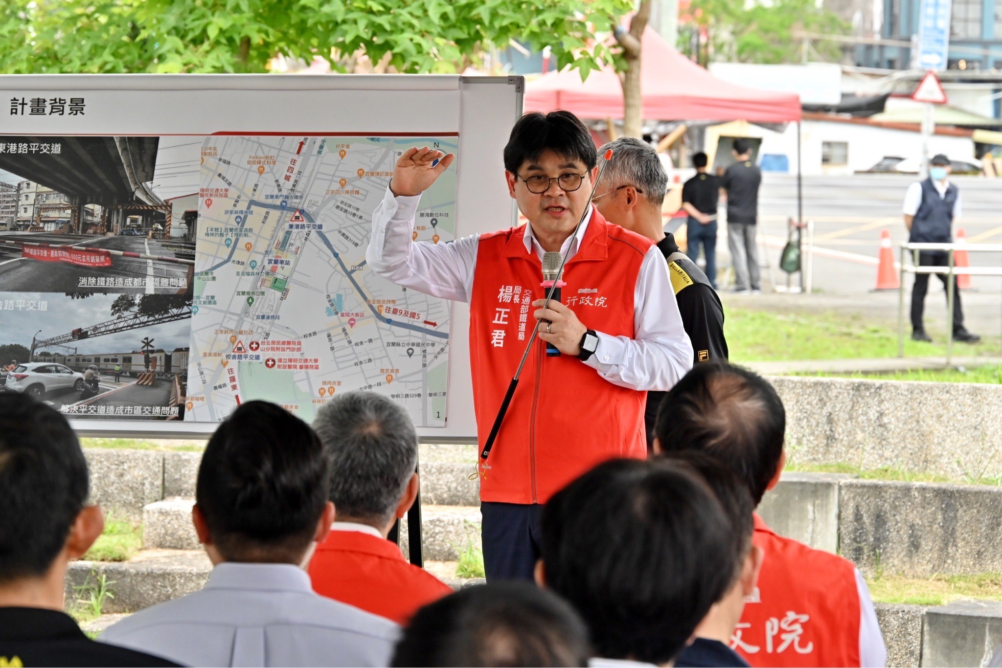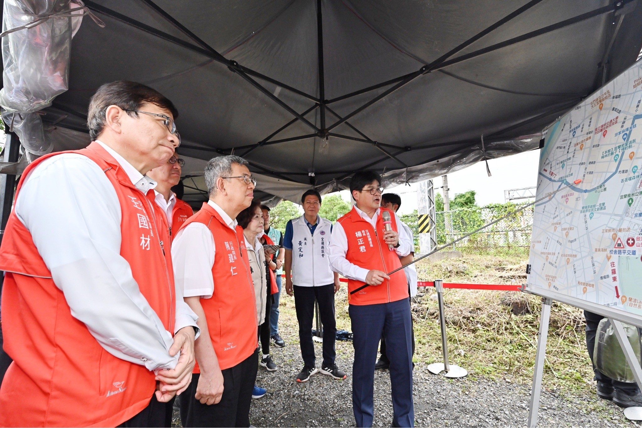 此行,陳院長抵達後,首先聽取交通部鐵道局楊正君局長說明宜蘭至羅東鐵路高架化計畫,致詞結束後,在楊局長陪同解說下,與行政院林子倫發言人、交通部王國材部長、路政及道安司黃運貴司長、鐵道局東部工程分局黃鳳岡分局長、宜蘭縣林姿妙縣長等人進行現地視察,了解鐵路周邊地區發展現況及鐵路高架化後的開發效益。