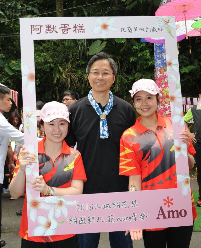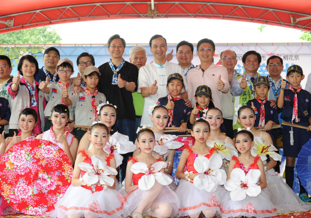 位於新北市土城區南天母廣場的「2016新北市客家桐花祭」主場,今天由張院長、新北市長朱立倫、與會貴賓一起擊鼓,並與一群可愛的童子軍共同揚傘(象徵「揚善」),正式為活動揭開序幕。