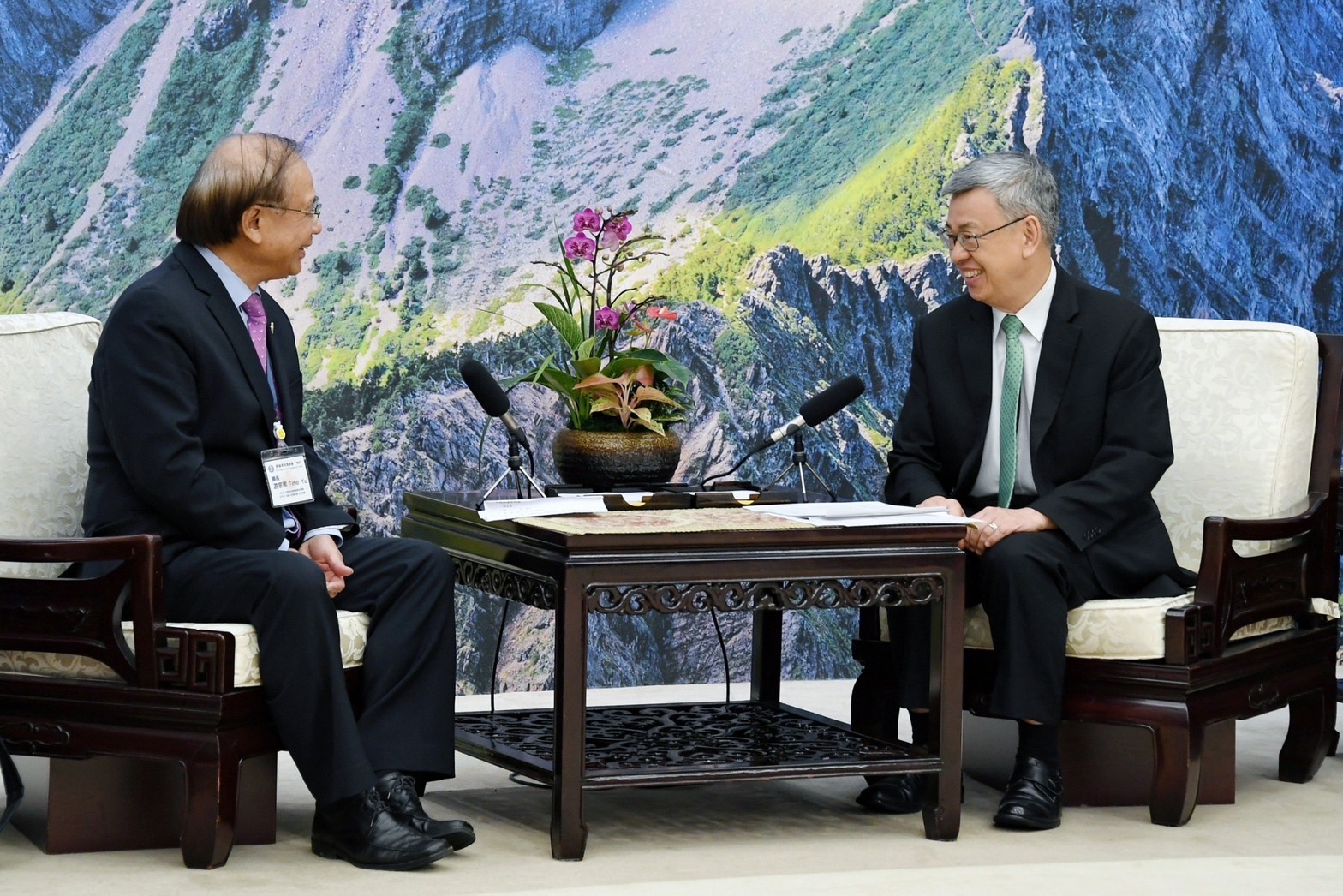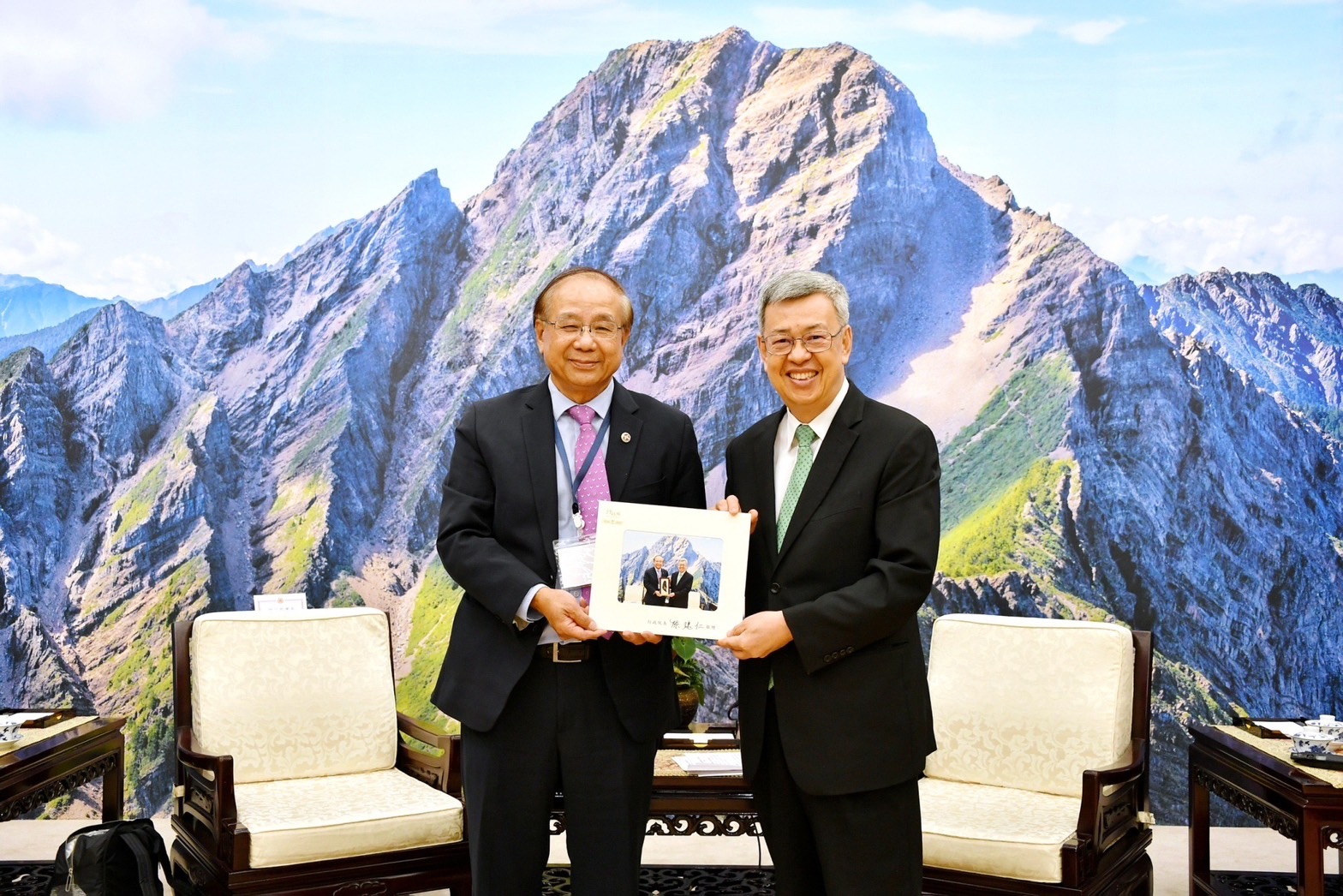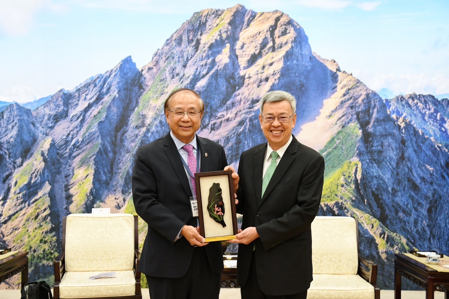訪賓一行由僑務委員會徐佳青委員長陪同,前來行政院拜會陳院長,行政院鄧振中政務委員、林子倫發言人也在座。院長並致贈臺灣造型彩繪漆畫紀念品予游團長,游團長則代表訪團回贈「CPTPP for Taiwan」玻璃水晶座,雙方並合影留念。