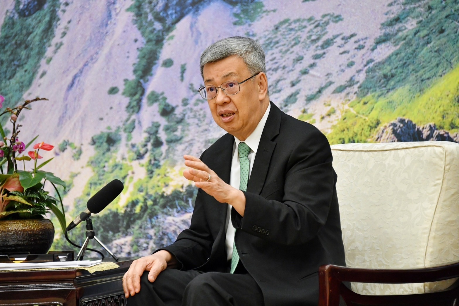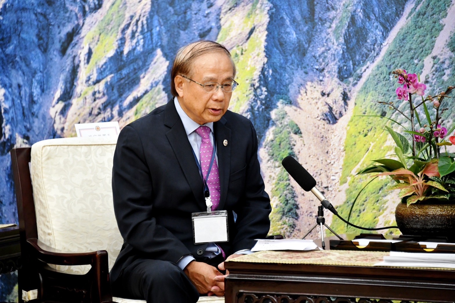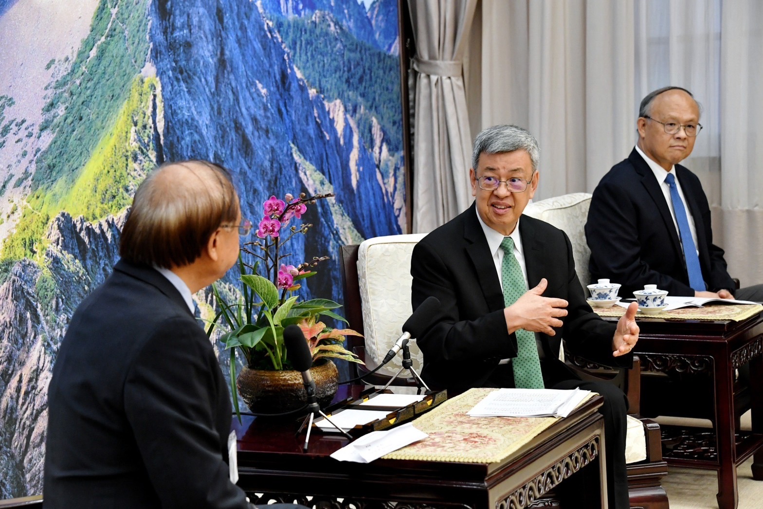 訪賓一行由僑務委員會徐佳青委員長陪同,前來行政院拜會陳院長,行政院鄧振中政務委員、林子倫發言人也在座。院長並致贈臺灣造型彩繪漆畫紀念品予游團長,游團長則代表訪團回贈「CPTPP for Taiwan」玻璃水晶座,雙方並合影留念。