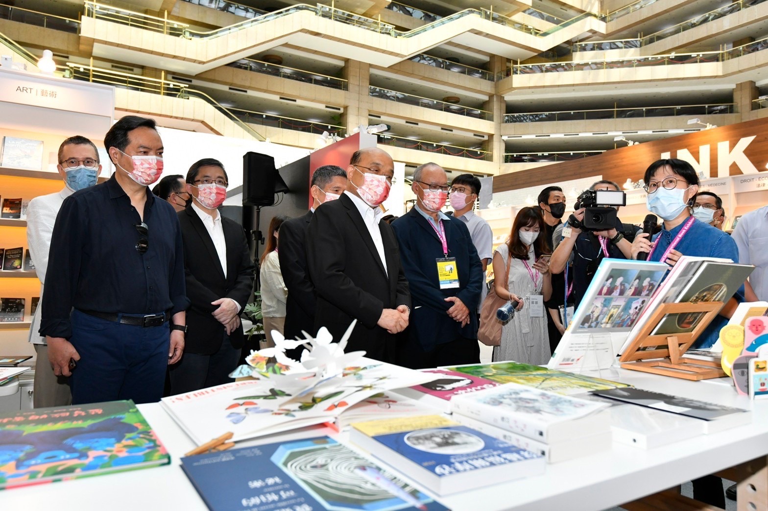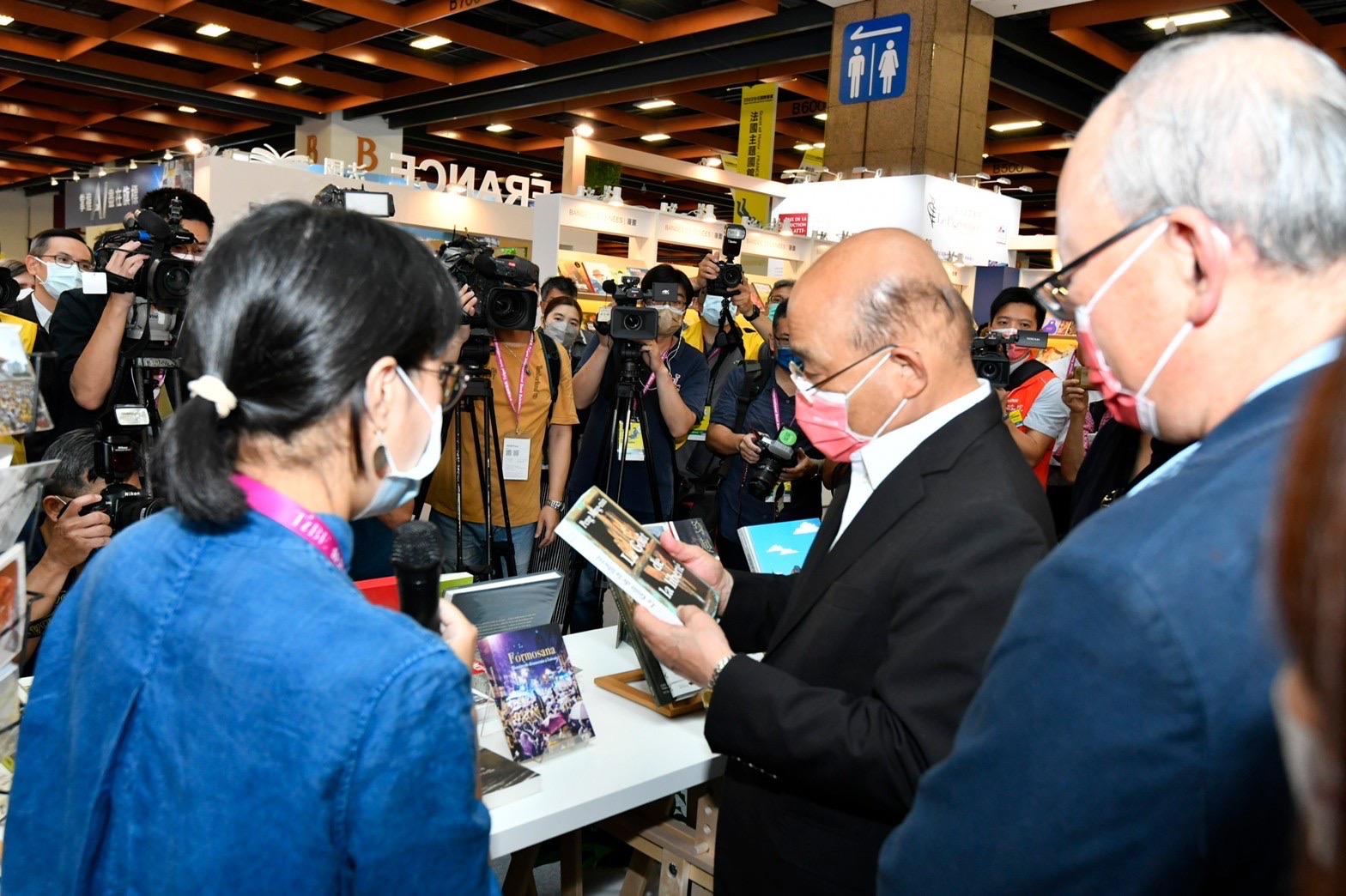 蘇院長蒞臨會場後,沿途聽取各展區出版社代表解說,瞭解台灣文學發展歷史、特色文學作家與作品,並不禁讚嘆文學世界多元豐富,可以讓前來書展的民眾徜徉在書香世界中,令人心曠神怡。此外,院長也與行政院李孟諺秘書長、羅秉成政務委員兼發言人、黃致達政務委員及文化部李永得部長等人互相討論,希望透過政策的推動,戮力讓台灣書展、國內出版及文化獲得更好的發展。