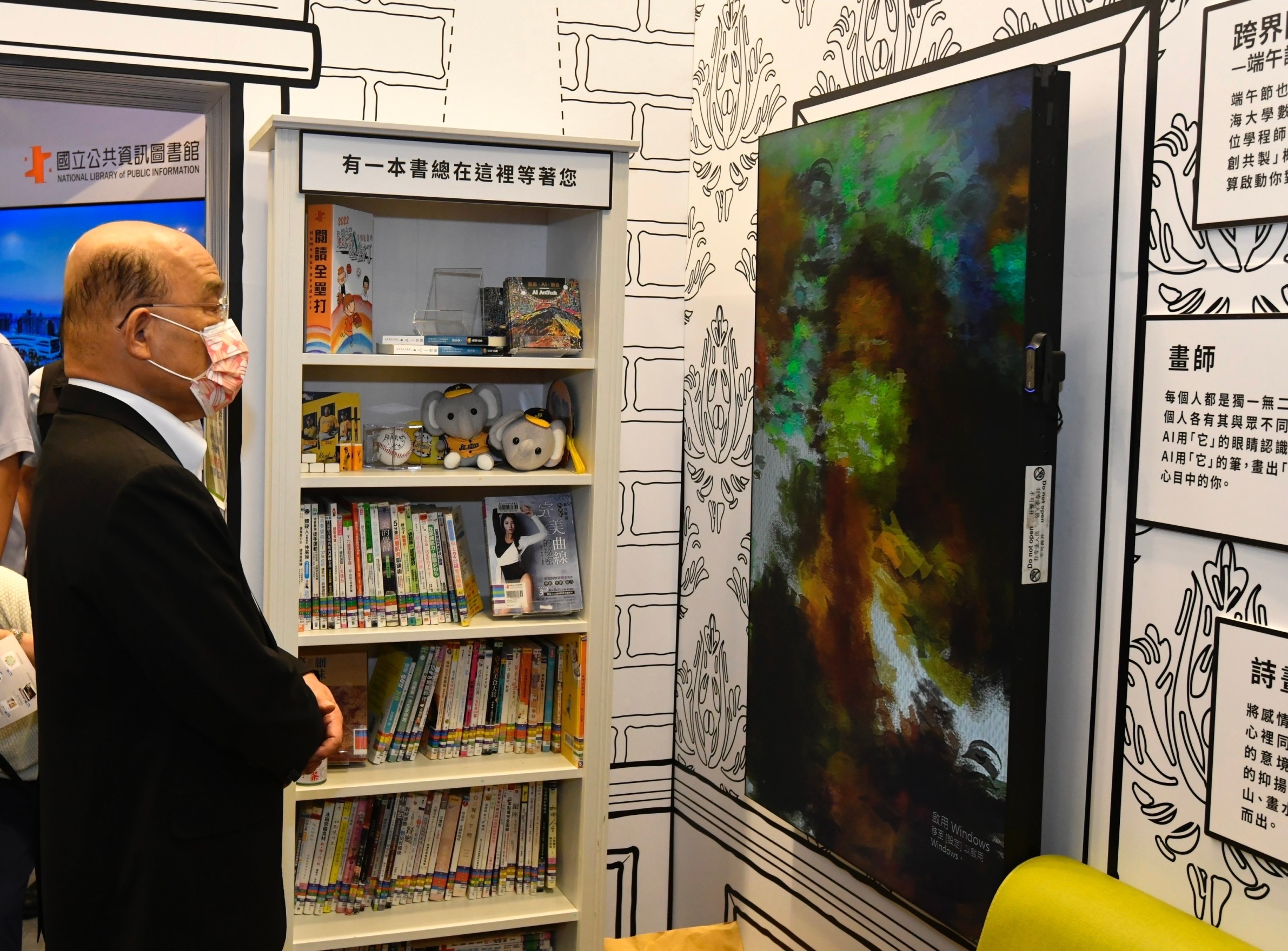 蘇院長此行參觀法國主題國館、讀字公民書區、文訊雜誌社、允晨文化、烏克蘭專區、聯合文學出版社、九歌出版社、印刻文學、經典雜誌社、讀書共和國、前衛出版社、大塊文化、開學文化、財團法人吳三連台灣史料基金會等展區,並與展區出版社代表們合影留念;此外,院長在國立公共資訊圖書館所設置的展區,也體驗人工智慧(AI)藝術科技,現場以聲控及電腦鏡頭拍攝方式,配合電腦程式演算,立即分別呈現山水畫的意境與觀賞者的印象派自畫像,令人讚嘆。