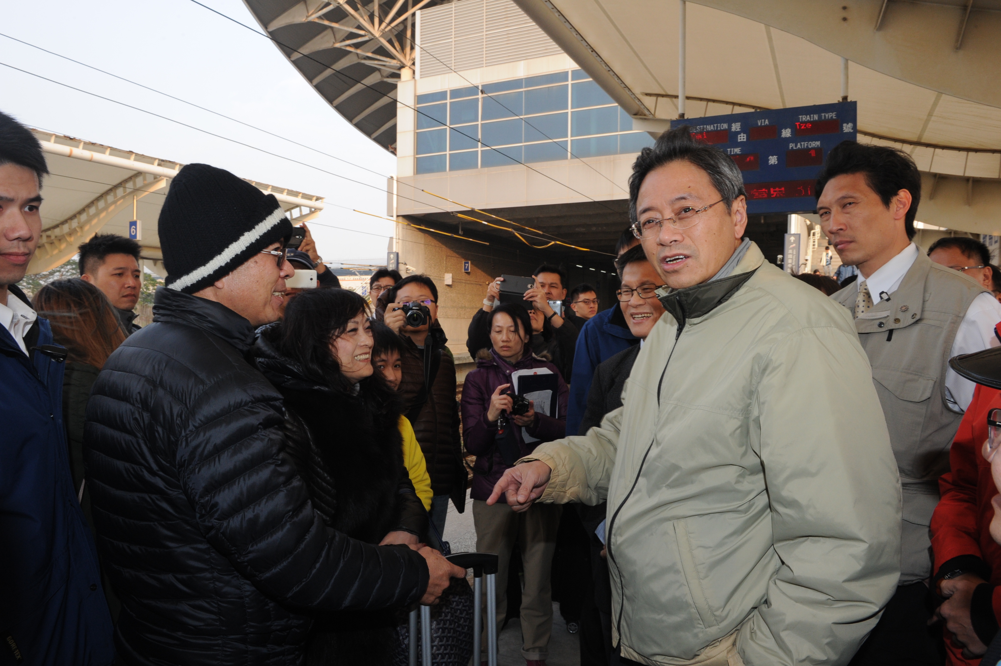 張院長也到臺鐵新烏日站,關心旅客排隊購票情形,並前往月臺瞭解列車疏運能量,張院長請在月臺候車旅客,共體時艱,共度難關。