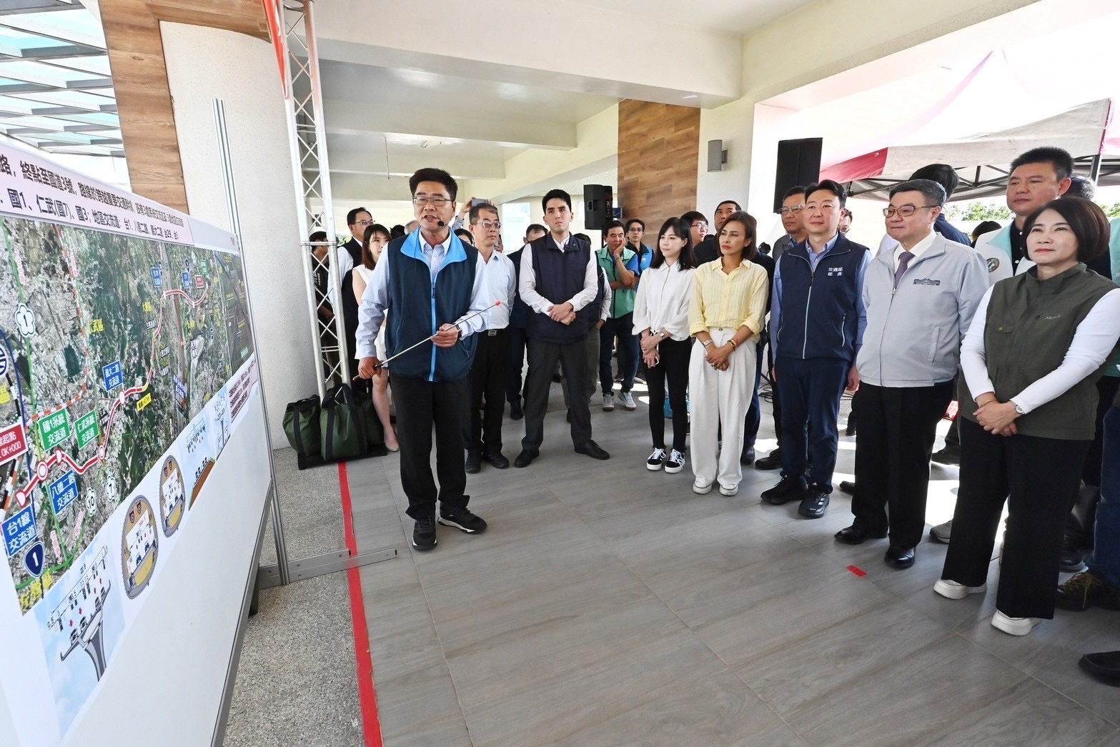 卓院長抵達後,首先聽取交通部公路局陳文瑞局長簡報說明「高雄-屏東間東西向第2條快速公路」興建規劃情形,並於致詞結束後偕同行政院李慧芝發言人、交通部陳世凱部長、行政院南部聯合服務中心許乃文執行長、邱議瑩立委、徐富癸立委、許智傑立委、屏東縣周春米縣長、高雄市政府王啟川副秘書長等人,在公路局新工南分局林俊和分局長解說下,進行現地視察並鳥瞰未來工程預定地,了解工程相關規劃。