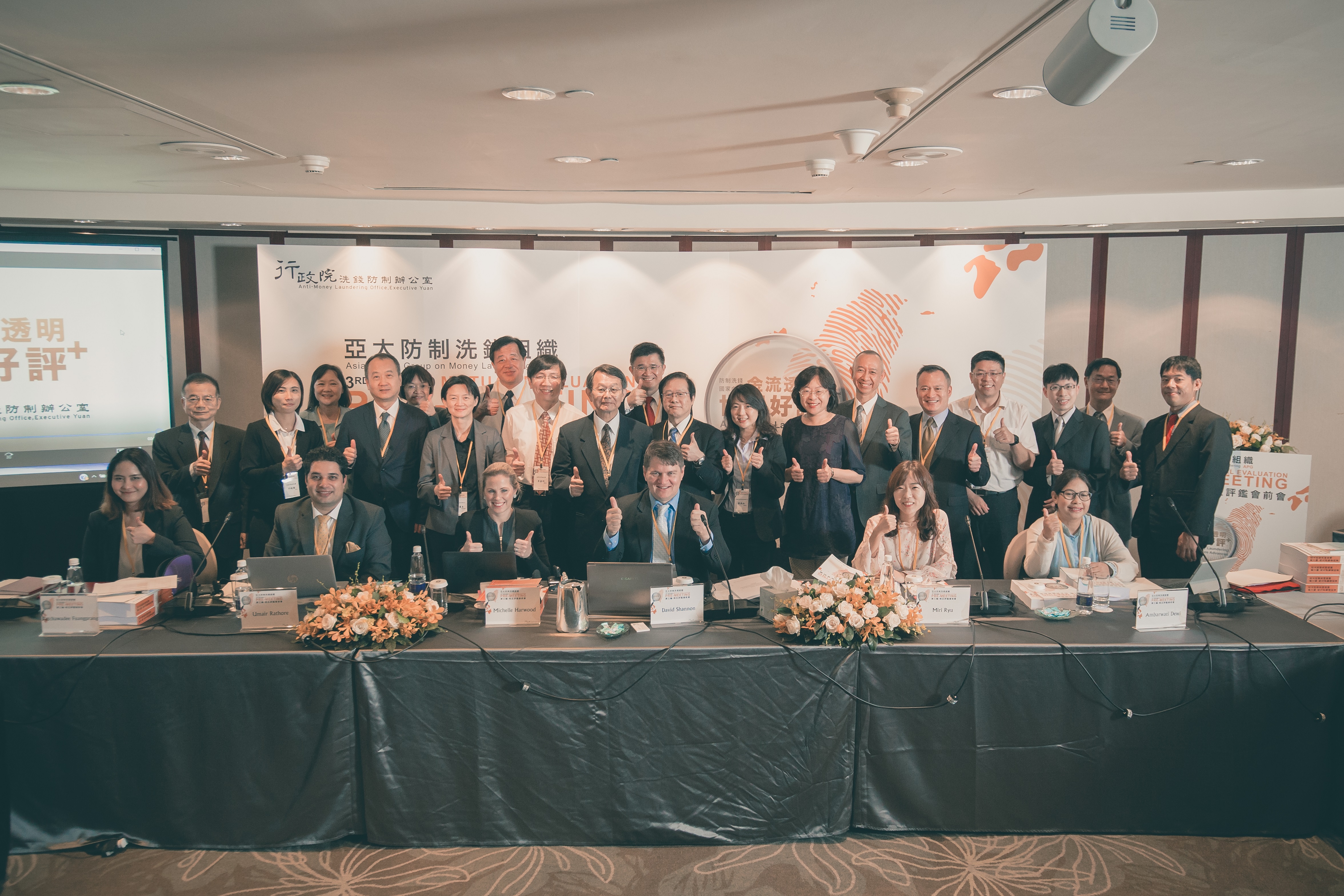 行政院洗防辦表示,APG大陣仗安排我國第三輪評鑑團共9位評鑑員,分別來自澳洲、泰國、南韓、印尼、美國、巴基斯坦及孟加拉等不同國家,在金融、執法與資恐等領域皆學有專精,經驗豐富。此次會前會將有6人與會,其中APG的Michelle Harwood於去(106)年12月初曾來台進行模擬評鑑,對台灣全體總動員準備相互評鑑印象深刻。