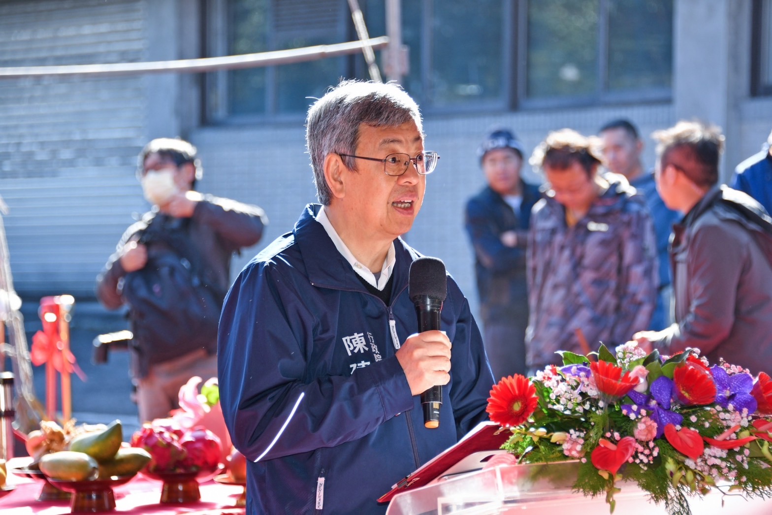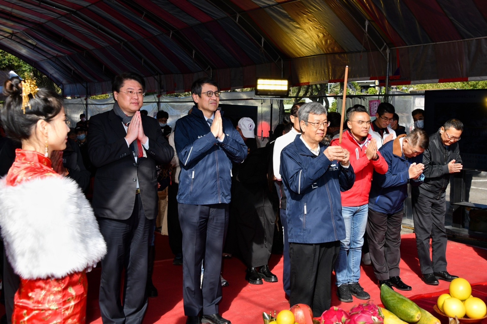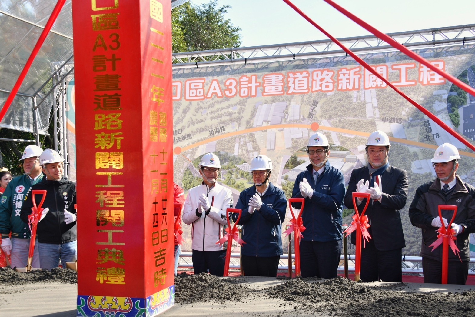 陳院長抵達後,首先與行政院林子倫發言人、內政部林右昌部長、國土管理署於望聖副署長、洪孟楷立法委員及新北市陳純敬副市長等貴賓一同在座位上合影留念,並聽取於副署長工程簡報。致詞結束後,院長和與會貴賓一同進行祈福儀式,上香祈求工程順利,並執金鏟起鍬三鏟,完成動土儀式。