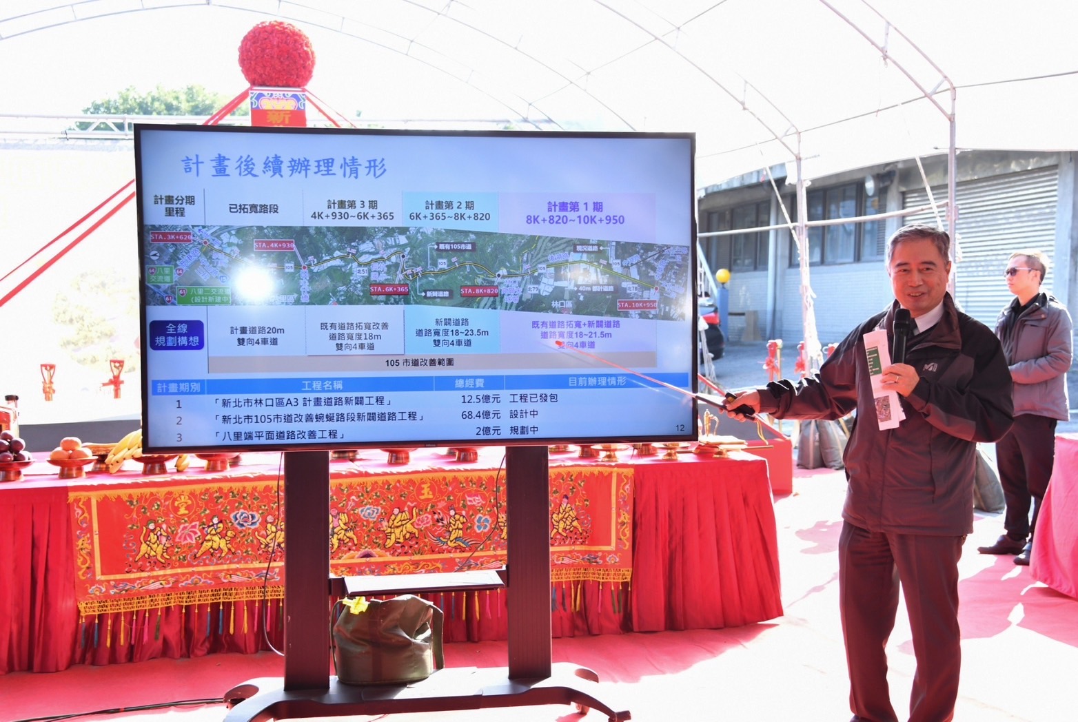 陳院長提到,林口是北部地區的運輸樞紐與產業重鎮,政府向來非常重視林口地區的發展及新北市交通建設,為了強化林口地區的交通韌性,紓解往返林口與八里的通勤車流,中央與地方攜手合作,透過內政部「生活圈道路交通系統建設計畫」補助經費,進行「新北市A3計畫道路」的道路拓寬與新闢工程,除將原有路段拓寬,規劃雙向4線車道、寬約2.5公尺的人行步道外,亦針對路線蜿蜒、縱坡大的路段進行改善,以提升行車安全與用路品質;未來也可串連「淡江大橋」、「臺北港特定區」與「林口工一工業區」等區域,優化貨物運輸路網。