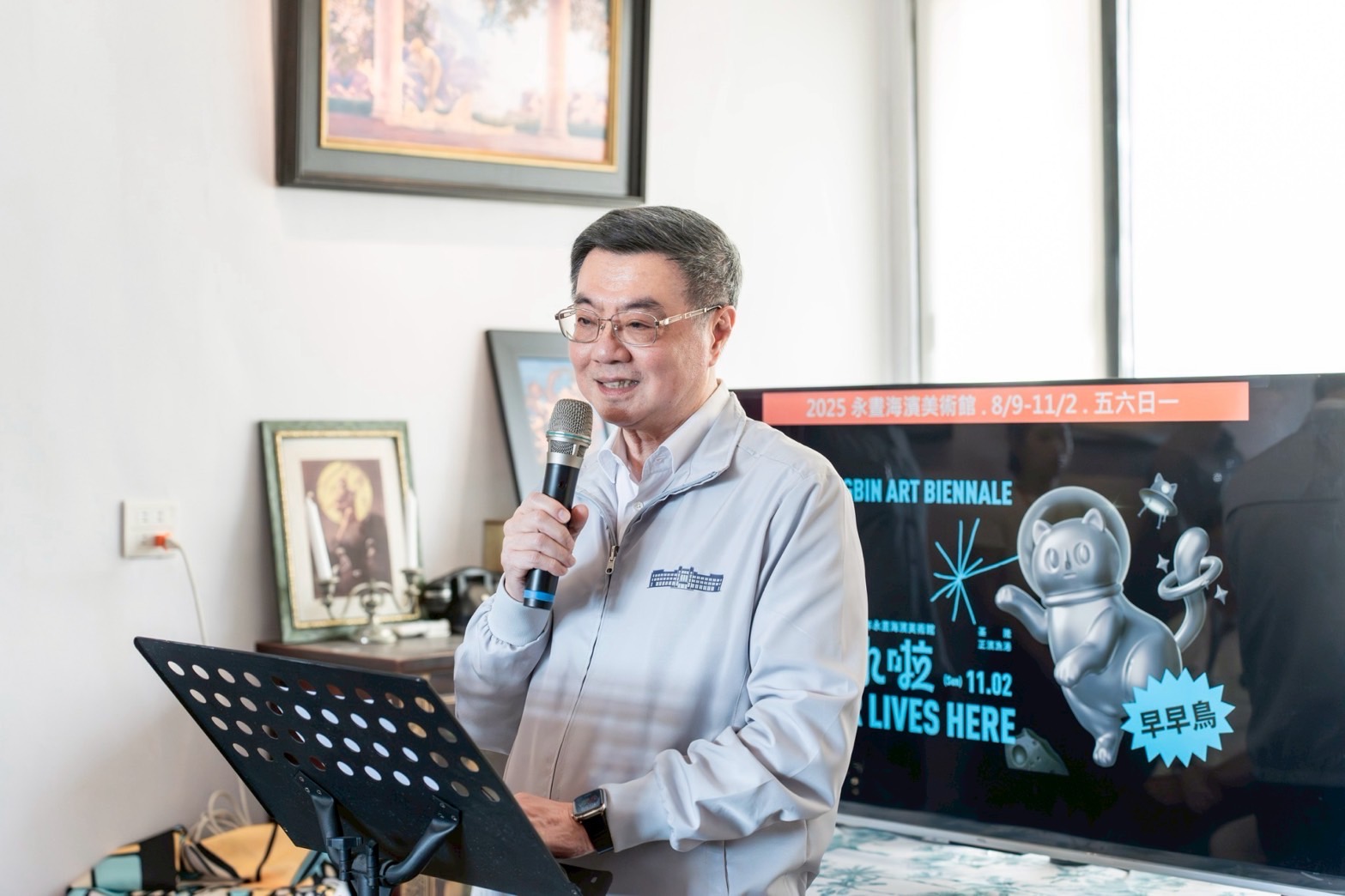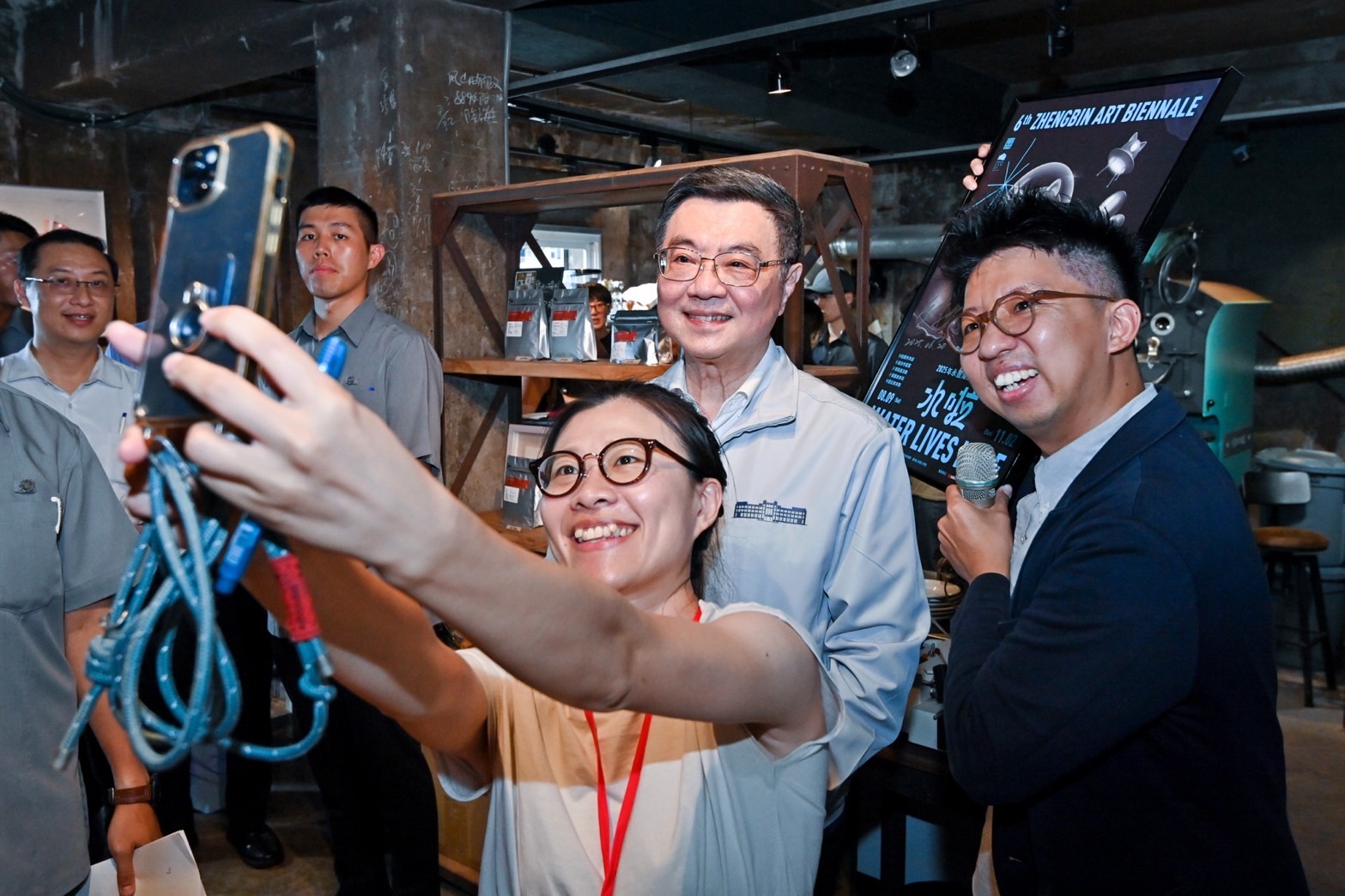 此行,卓院長抵達後,首先聽取星濱山共創工作室林書豪創辦人說明「基隆創意永續港口計畫」。致詞結束後,院長前往參訪「Space Moor」駐創空間,聽取該空間如何由昔日修船工廠,轉變為青年創作者進駐與展演空間的歷程;隨後,院長前往參訪「茹絲咖啡」,該店除販售咖啡相關商品,亦不定時提供青年進行快閃店合作,店家並現場手沖咖啡給院長品嚐;接續,林書豪創辦人贈送院長《地方藝術感染指南》書籍,院長也在「2025年永晝海濱美術館」展覽海報上簽名留念。最後,院長與行政院李慧芝發言人、國發會劉鏡清主委、文化部徐宜君次長、王正旭立委、基隆市謝國樑市長、林書豪創辦人及在地青年團隊們,在正濱漁港彩色屋前合影留念。