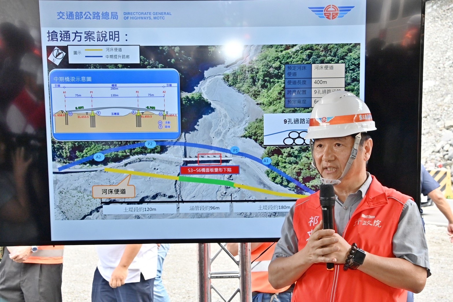 陳院長指出,交通部會依階段搶通便橋,第一階段預計明日中午前完成現有橋面搭設鋼梁,供居民戒護步行通過;第二階段將視天候及溪底狀況許可,希望8月12日前能搶建完成河床涵管便道,方便人車通行;第三階段則以9月30日搶修完成鋼便橋為目標;至於明霸克露橋中期修復工程,將以大跨距懸臂橋梁工法施作,預計於2025年完工。另針對桃源區索阿紀吊橋及撒拉阿塢橋安全性強化及修繕部分,他也會責成交通部、原住民族委員會予以協助。
