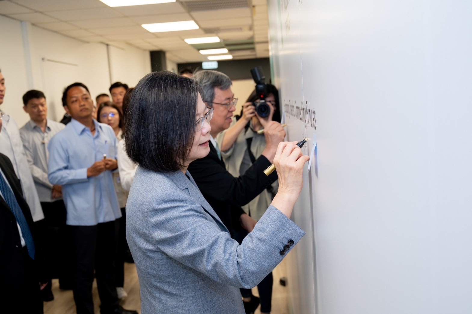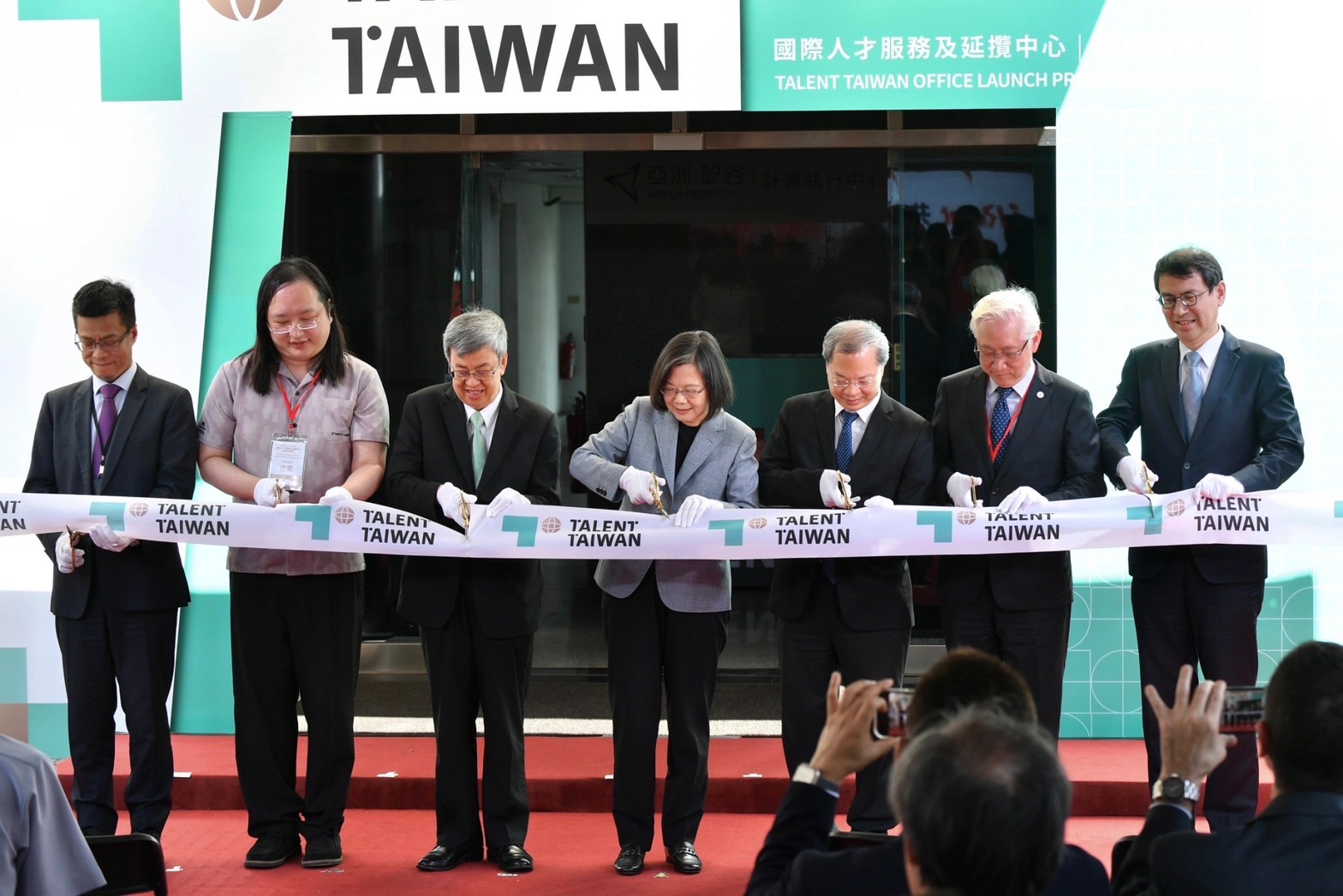 致詞結束後,蔡總統、陳院長、總統府黃重諺副秘書長、行政院林子倫發言人、國家發展委員會龔明鑫主委、國家科學及技術委員會吳政忠主委、數位發展部唐鳳部長一同手持金剪進行剪綵,在倒數聲中完成啟用儀式;隨後一行人與台灣美國商會執行長林博智(Patrick P. Lin)、歐洲在臺商務協會執行長何飛逸(Freddie Höglund)、台北市日本工商會總幹事塗師田克哉、澳紐商會執行長劉少浡(Glenn Lio)等貴賓合影留念。