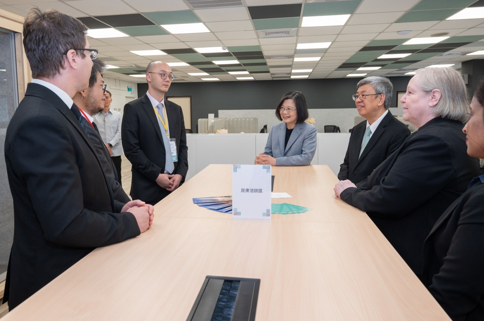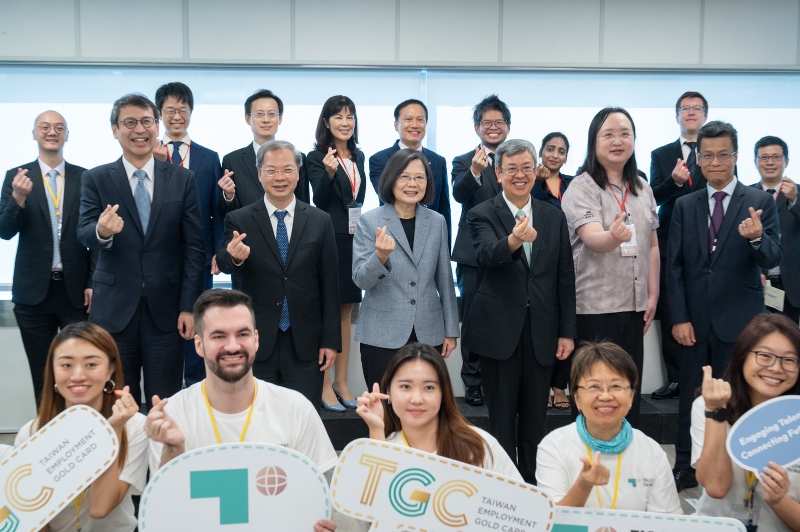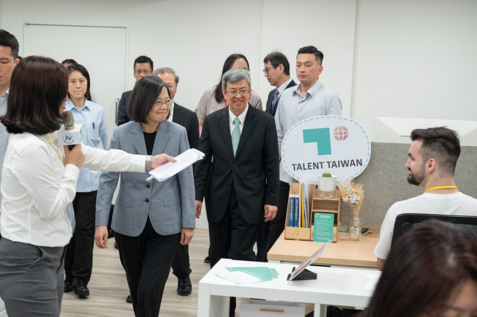 隨後,陳院長陪同蔡總統參觀該中心4F辦公室,先於Talent Taiwan簽名牆上落款簽名,並在該中心副執行長連以婷導覽解說下,逐一參觀協助諮詢中心、民眾洽談區與法律及稅務等專業諮詢區,了解該辦公室提供服務內容及運作情形;蔡總統、陳院長也與YouTube平臺共同創辦人Steve Chen(陳士駿)、美國在台協會商務組前組長Helen Peterson、TAEF臺灣亞洲交流基金會訪問學者Sana Hashmi、Taiwan Stands with Ukraine創辦人Alex Khomenko等4位就業金卡持有代表互動交流並合影留念。