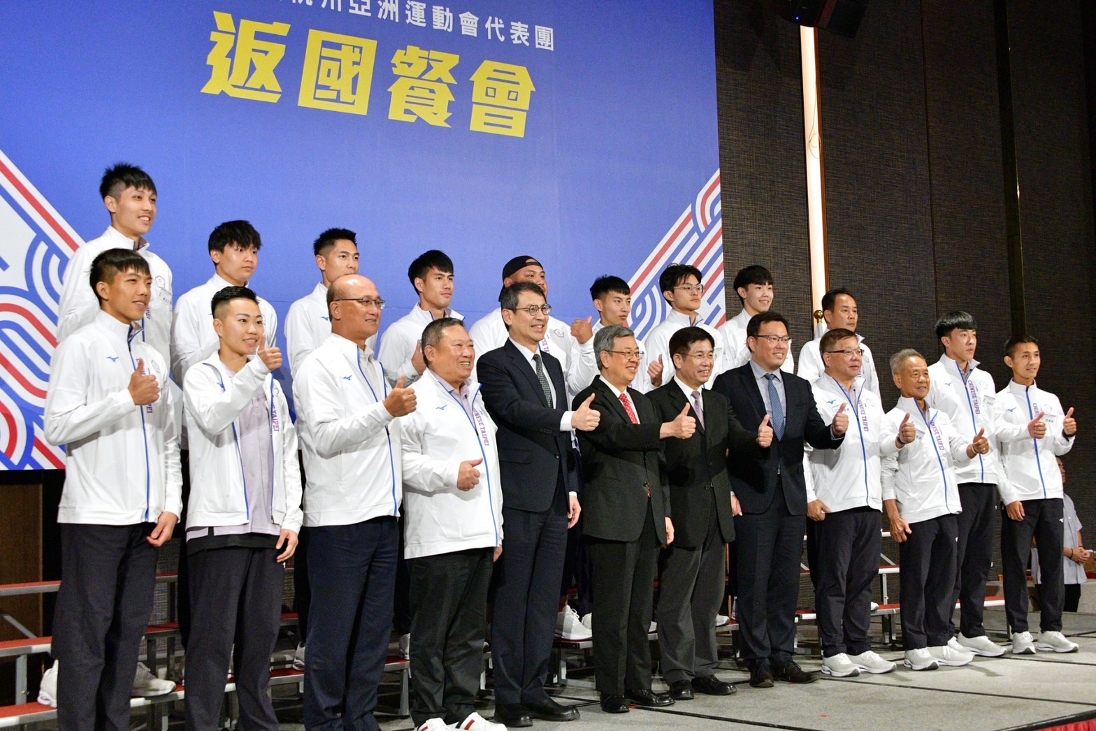 行政院長陳建仁今(12)日出席「第19屆杭州亞洲運動會返國餐會」時表示,我國本屆亞運榮獲19金20銀28銅的優異成績,他要向代表團致以最高的敬意和謝意。政府相當重視體育發展,為成為選手及教練們的強力後盾,明(2024)年體育相關預算將超過160億,增加輔助運動賽事、推動體育訓練的經費及人力。院長期勉選手繼續努力,朝著2024巴黎奧運的目標邁進,讓臺灣在國際運動賽事更加綻放光芒,向世界證明臺灣能成為體育強國。