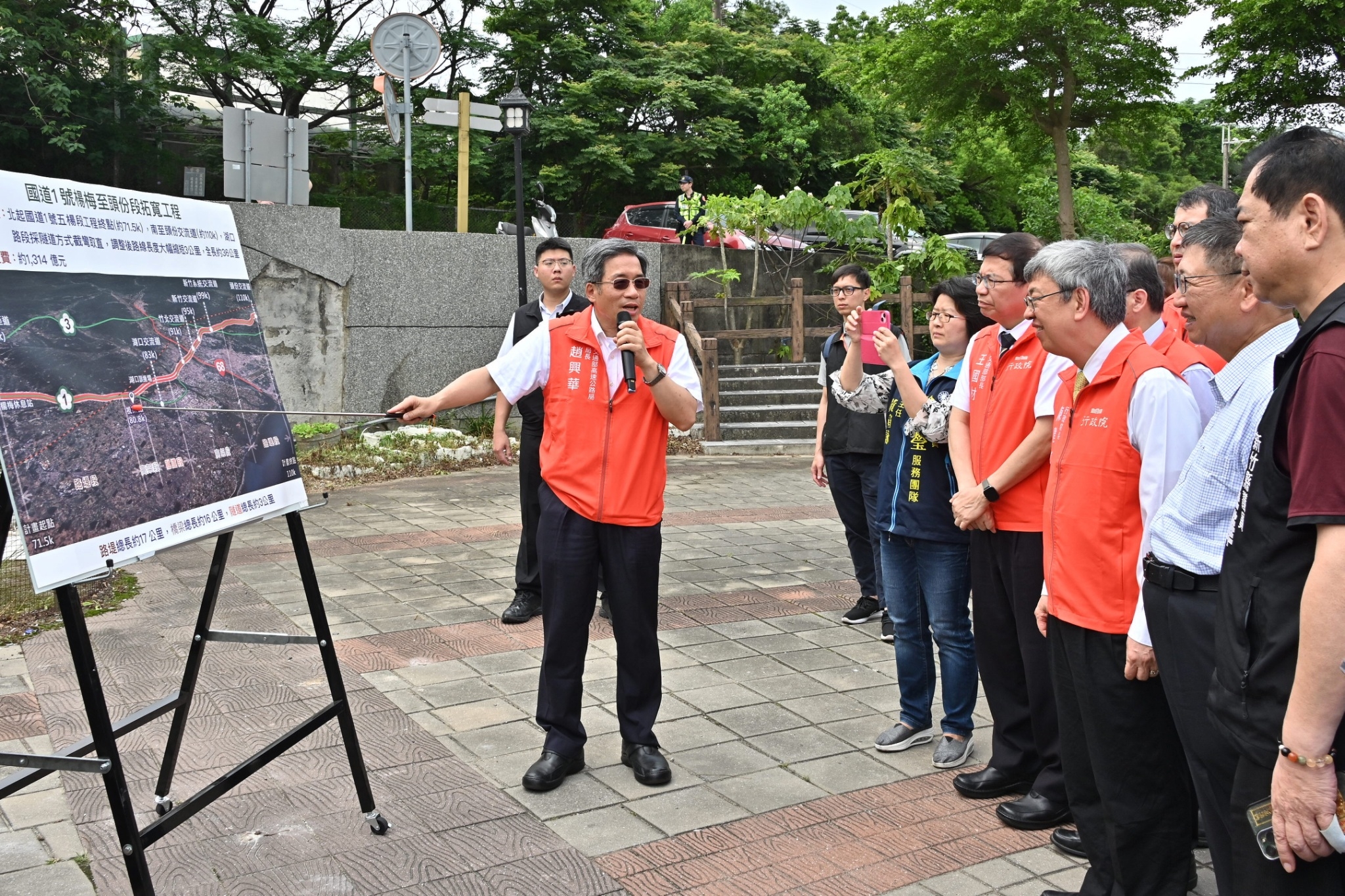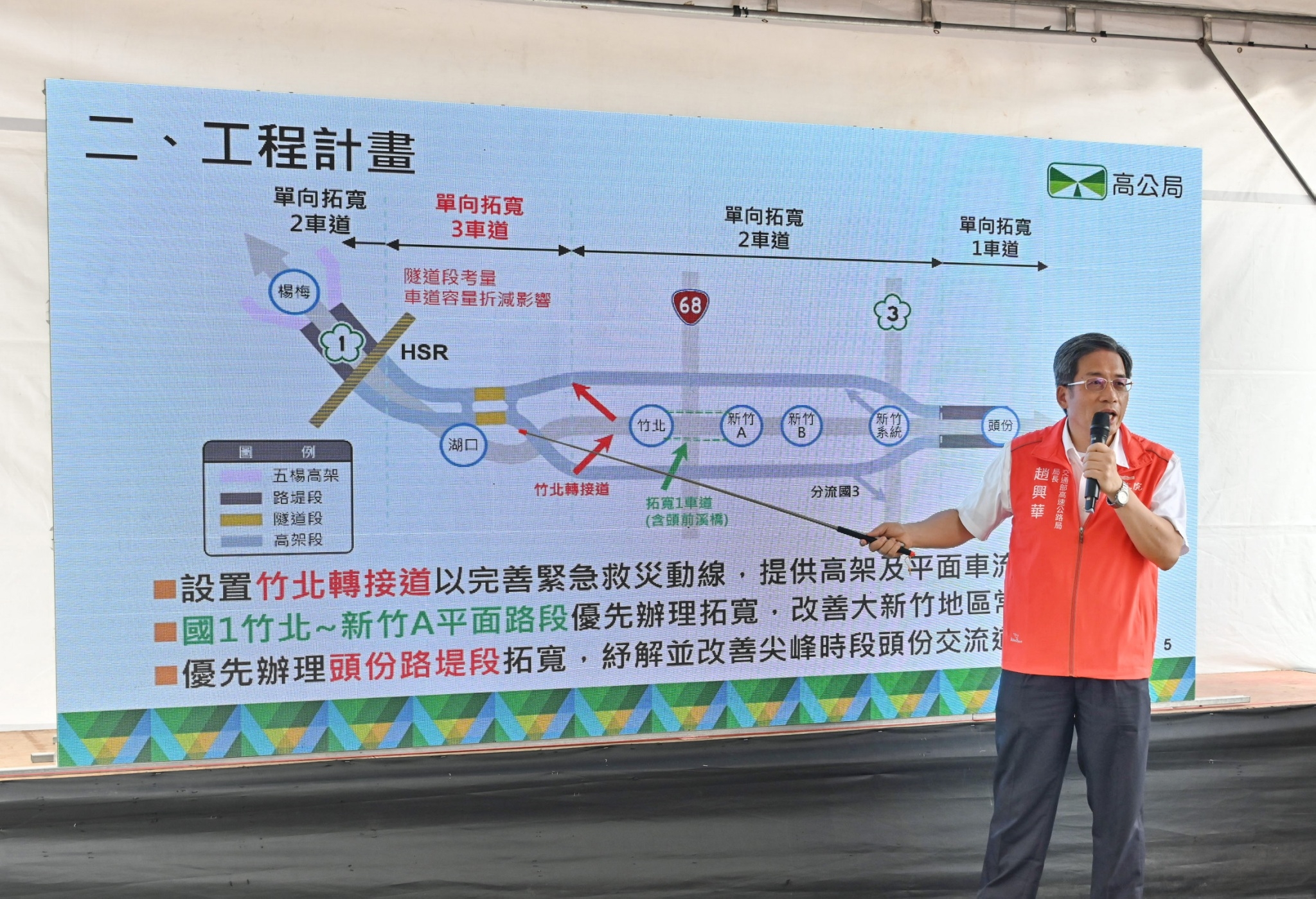 陳院長到場後,首先聽取交通部高速公路局趙興華局長說明「國道1號楊梅至頭份段拓寬工程」簡報。趙局長於簡報時表示,國道1號五楊高架南下楊梅端終點因車道不平衡,連續假期經常出現壅塞,因此規劃拓寬工程於新竹系統以北採2-3車道拓寬,新竹系統以南則分流國3採單車道進行拓寬,並考量高架及平面間車流轉換需求,規劃於竹北交流道北側設置轉接道,除可提升整體運輸效能外,並可完善緊急救災動線,兼顧效率與安全。而為減輕交通影響,該工程規劃採半半施工,先做南下線再做北上線,施工期程約6年,預計115年初開工、121年8月底完工。未來完工後,盼能改善國道1號楊梅至頭份路段交通壅塞情形,轉移中長程車輛3成以上改走拓寬路段,提升國道服務水準。