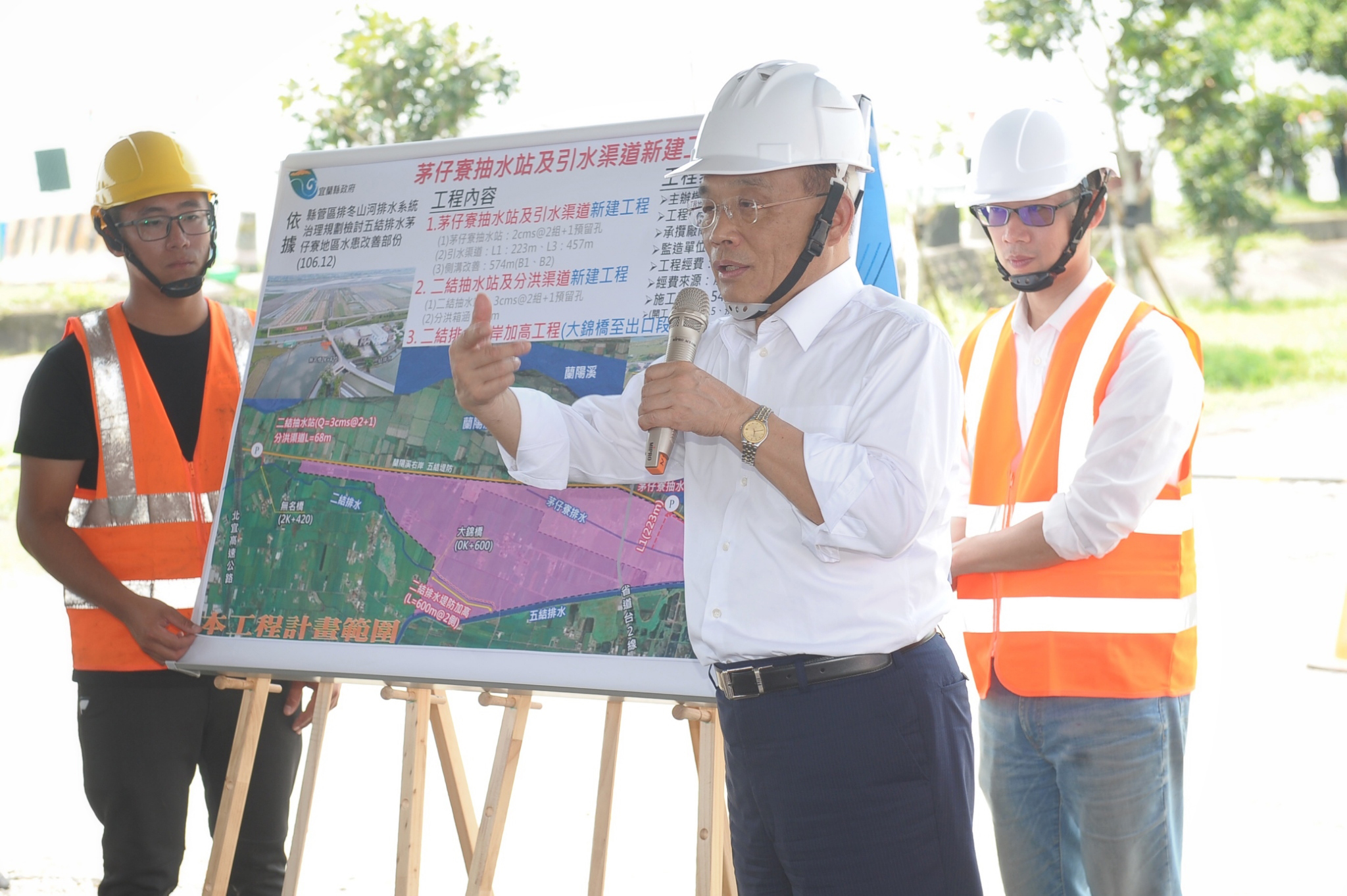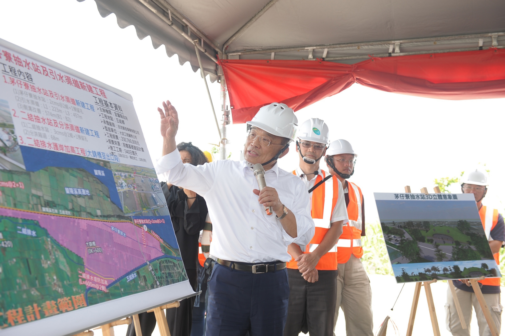 稍後,蘇院長視察「茅仔寮抽水站及引水渠道新建工程辦理情形」時表示,他曾任屏東縣及台北縣長,了解地方淹水之苦,因此解決淹水問題很重要。蘇院長提到,蔡英文總統提出「前瞻基礎建設」的水環境計畫治水,日前亦親自視察五結抽水站新建工程。政府投入宜蘭縣的治水經費約14.2億元,其中前瞻基礎建設預算就有6.4億元。