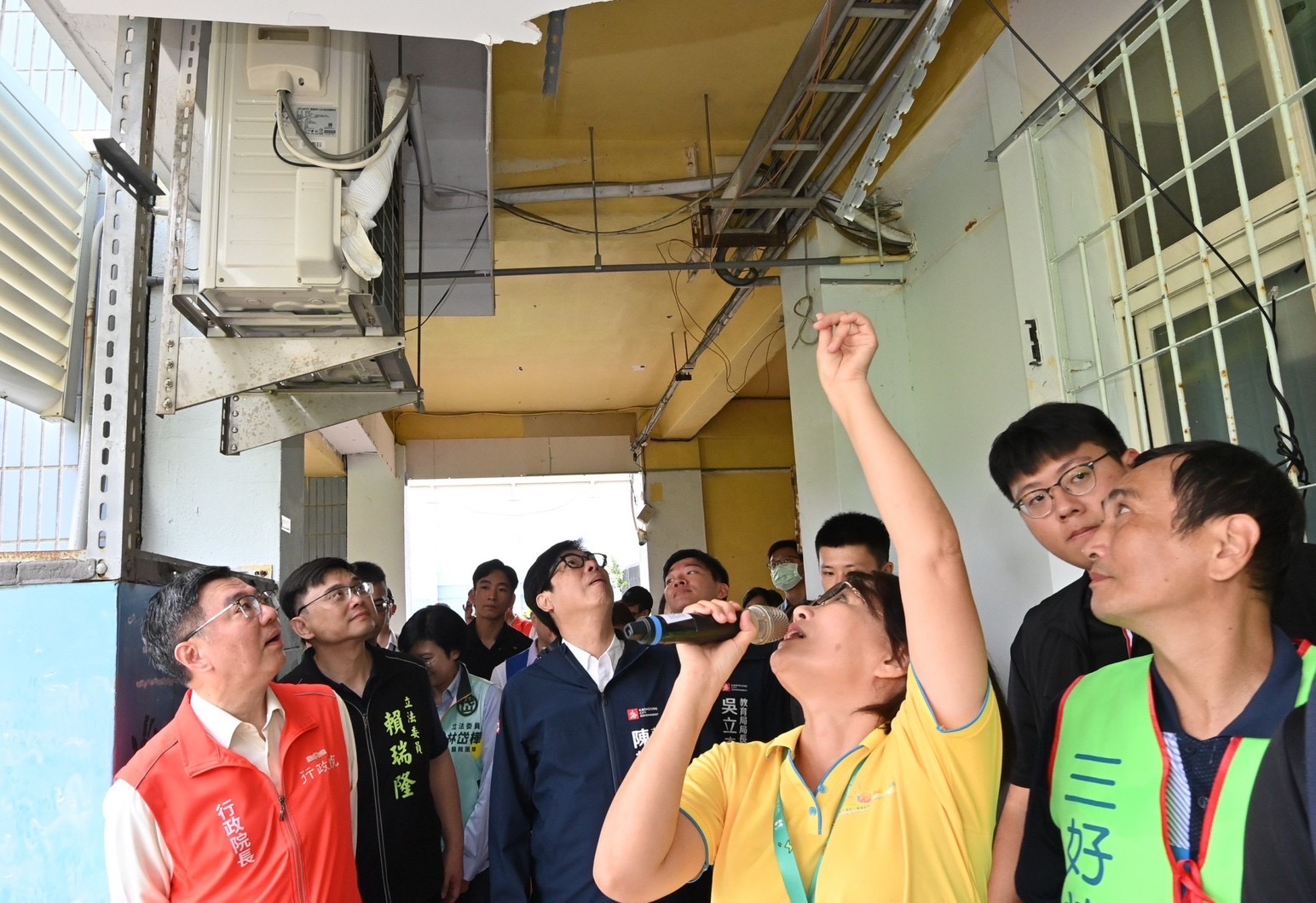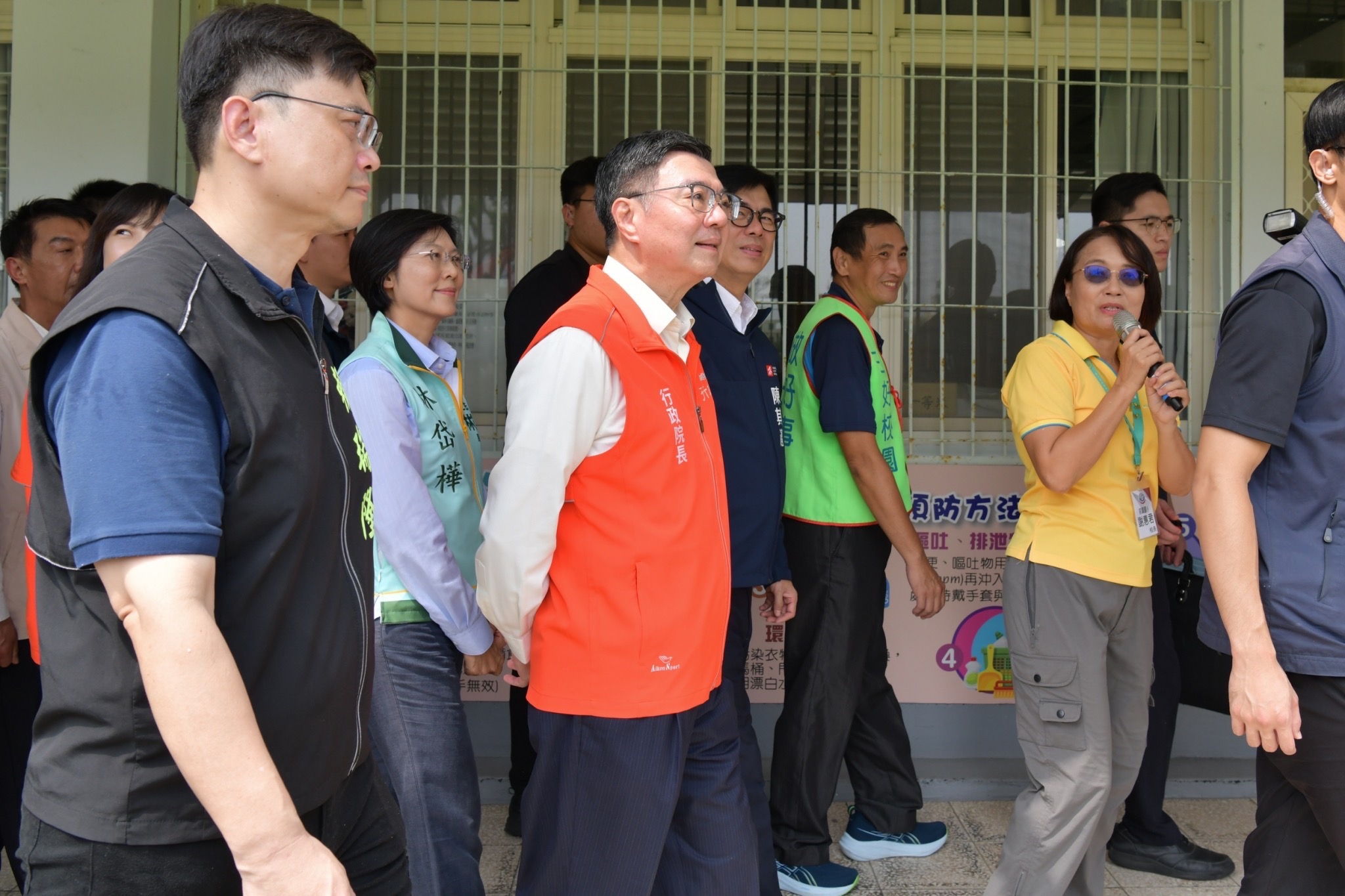 致詞結束後,卓院長偕同行政院李慧芝發言人、教育部鄭英耀部長、經濟部郭智輝部長、行政院南部聯合服務中心許乃文執行長、謝文斌副執行長、教育部國教署戴淑芬副署長、林岱樺立委、邱議瑩立委、許智傑立委、賴瑞隆立委、高雄市陳其邁市長、吳立森局長等人,現地視察該校活動中心及勤學樓廁所災損情形、勤學樓走廊前大草皮周圍校樹傾倒情形、懷德樓五年一班教室及廁所修復情形。