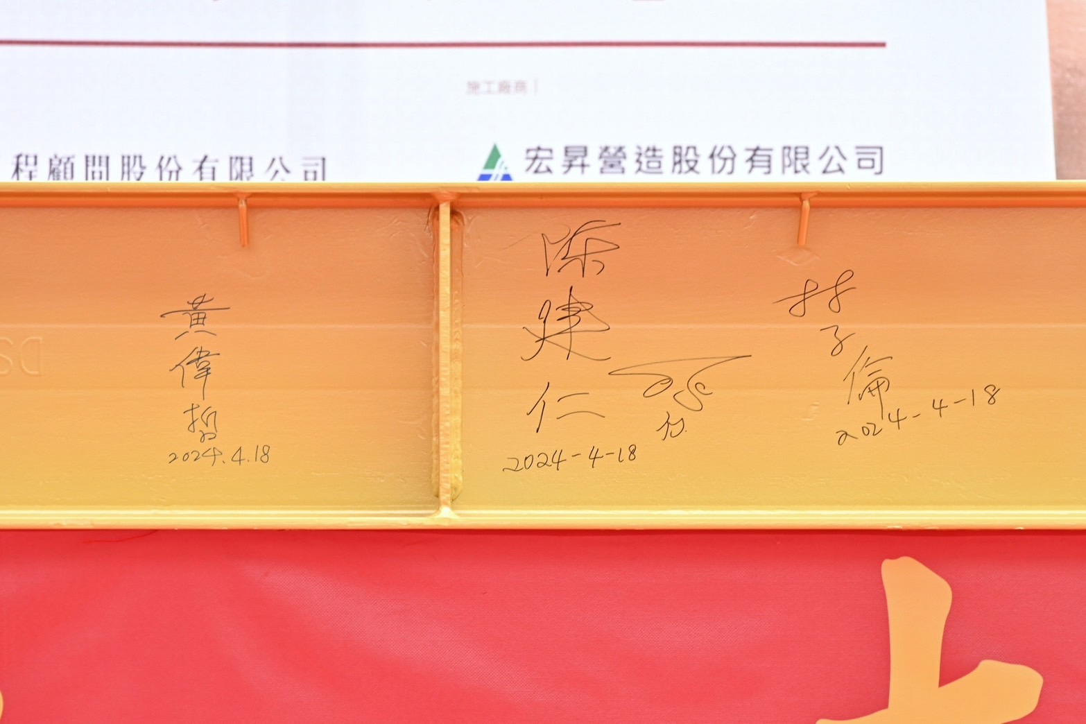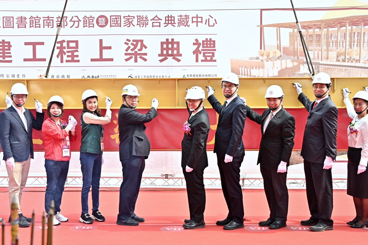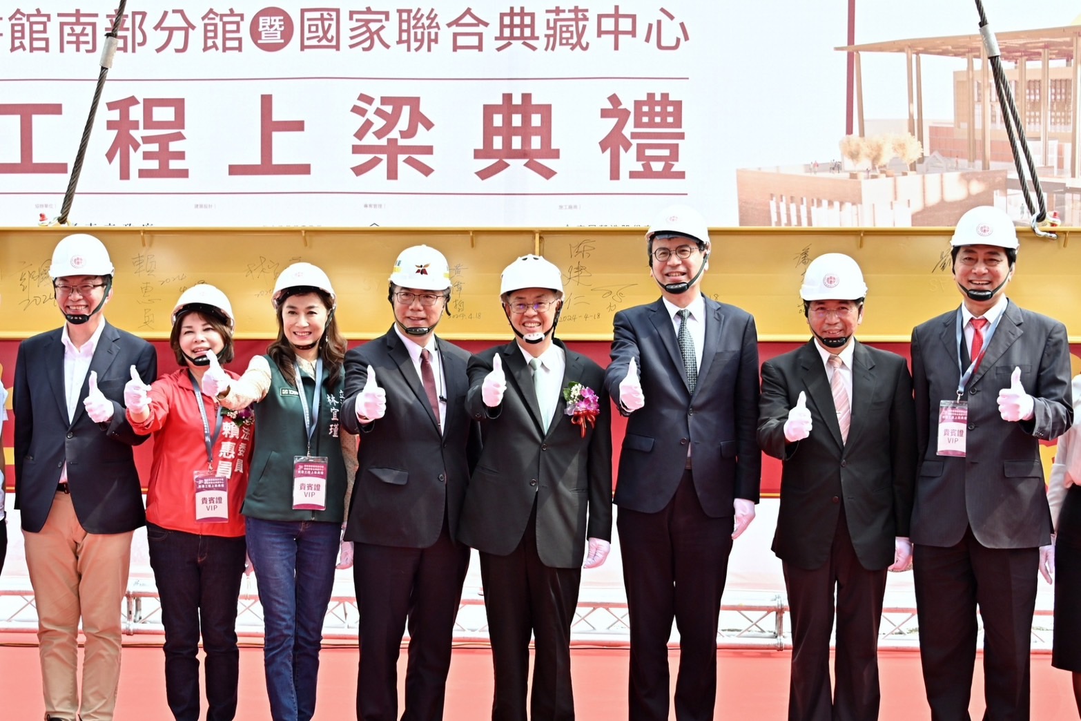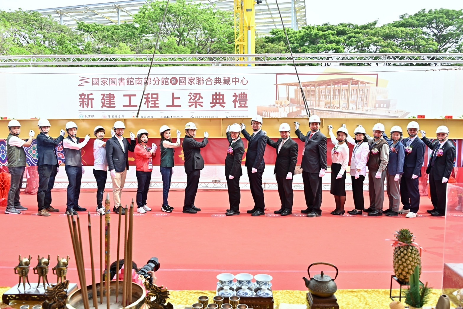 致詞結束後,陳院長與行政院林子倫發言人、教育部潘文忠部長、國家圖書館王涵青館長、林宜瑾立委、林俊憲立委、陳亭妃立委、郭國文立委、賴惠員立委、臺南市黃偉哲市長等人,進行祈福祝禱儀式,並於梁上簽名及合影,隨後一同觀看鋼梁吊掛上升,完成上梁儀式。