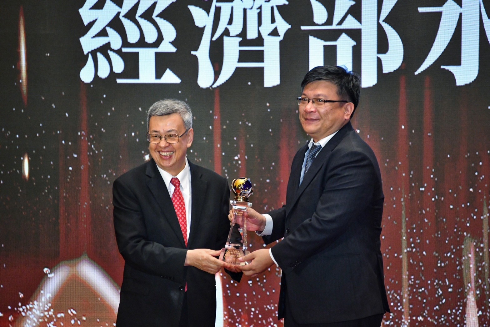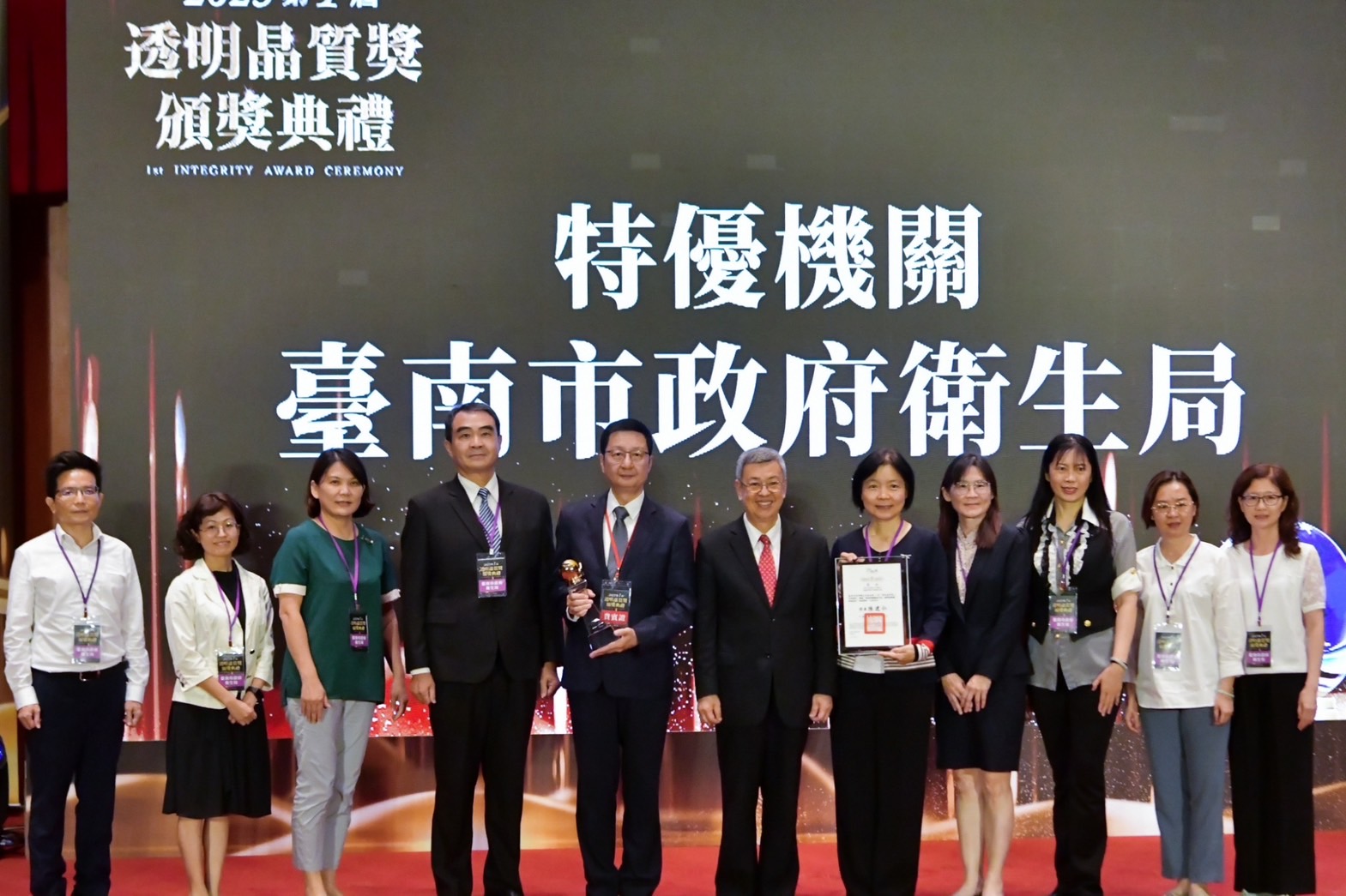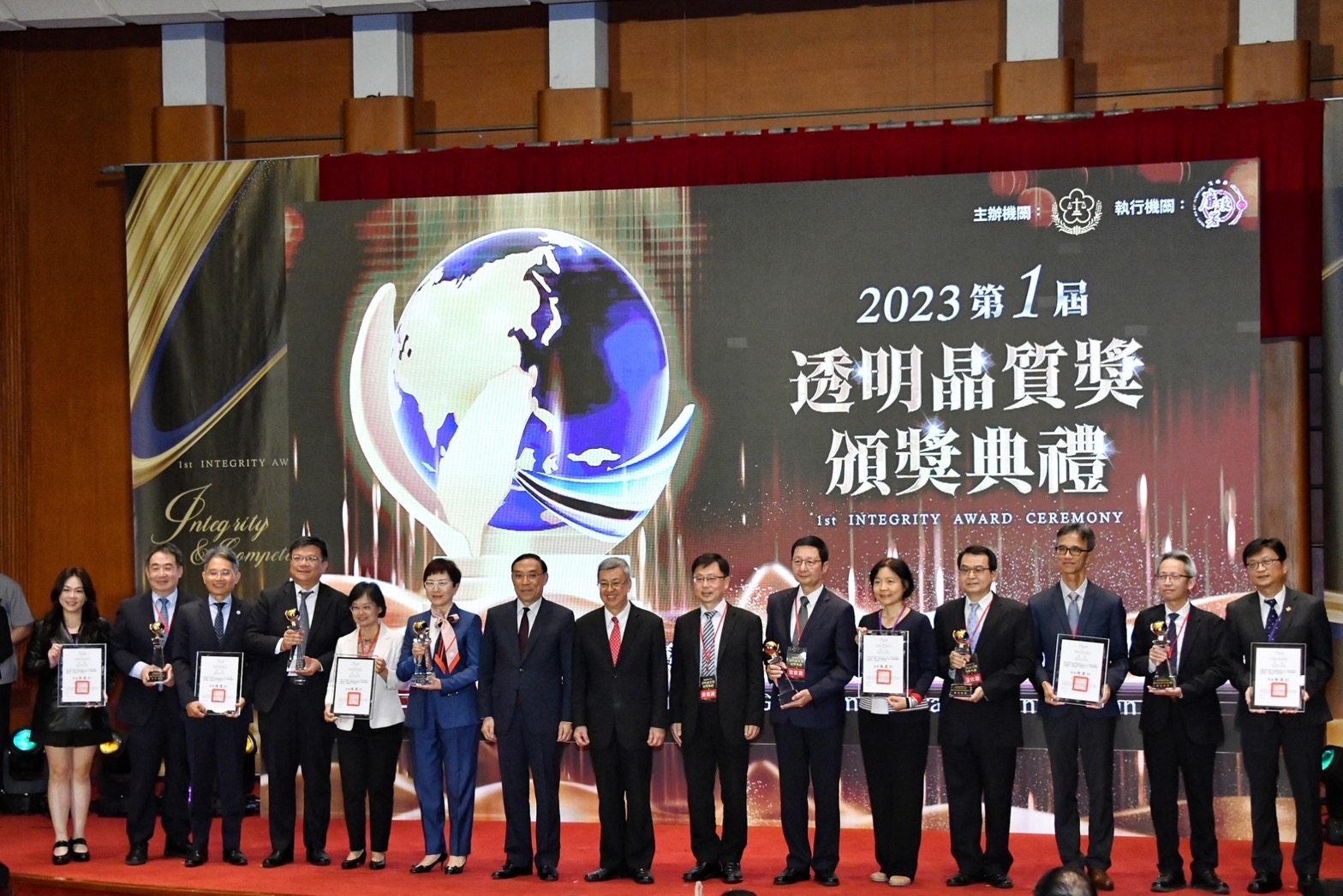 陳院長到場後,與行政院羅秉成政務委員、林子倫發言人、法務部蔡清祥部長、陳明堂次長、廉政署莊榮松署長、財政部莊翠雲部長、行政院人事行政總處蘇俊榮人事長、經濟部曾文生次長等貴賓,於座位上與現場來賓進行大合影,隨後觀賞典禮開幕影片。致詞結束後,院長逐一頒發獎座及獎狀予6個「機關整體廉能作為」類的特優機關(財政部北區國稅局、經濟部水利署、臺北市政府地政局、桃園市政府航空城工程處、臺中市政府地方稅務局、臺南市政府衛生局)與4個「創新廉能措施」類的優選機關(勵志中學、農業部農村發展及水土保持署、高雄榮民總醫院、臺南市政府地政局),並分別與各得獎團隊合影留念。