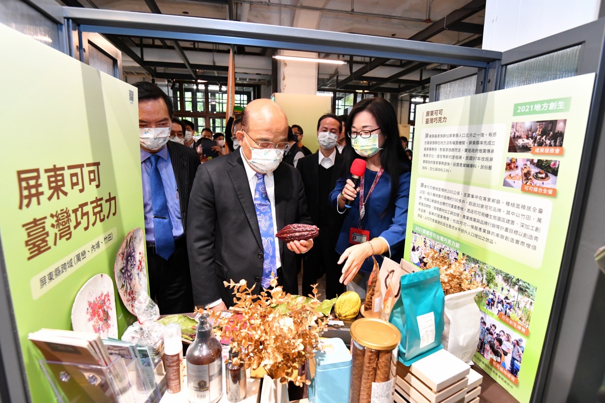 蘇院長也提到,屏東竹田、內埔、萬巒等地區以往多種植檳榔,但現在改種植可可作物,面積達200公頃,成為全臺最大的可可栽種區,而利用可可所製成的巧克力更獲得國際金牌的殊榮,十分了不起,也改變地方栽種的生態,並為地方帶來收益。院長表示,國人喜歡到日本京都遊覽廟宇、赴歐洲參觀教堂,以及到美國加州品嚐葡萄酒,臺灣也應發展出具有地方特色的產業,尤其在國際嚴峻疫情下,應將各部會先前配合振興五倍券所發送的加碼券,連結地方創生特色,鼓勵國人在國內消費,將國人一年至國外觀光約8千億的產值留在國內,活絡國內經濟與觀光市場。